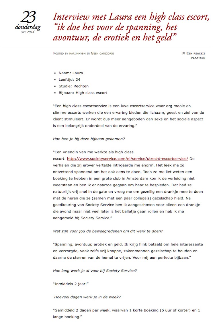 On October 23rd, blog "Bijbaanbrekend" published an interview on an escort working at escortservice Society Service. Laura, high class escort at Society Service and featured in the book Escort Bijbel was interviewed for a an online blog called "Bijbaanbrekend" about student jobs. The article was published in Dutch but below you can find a summary in English.
