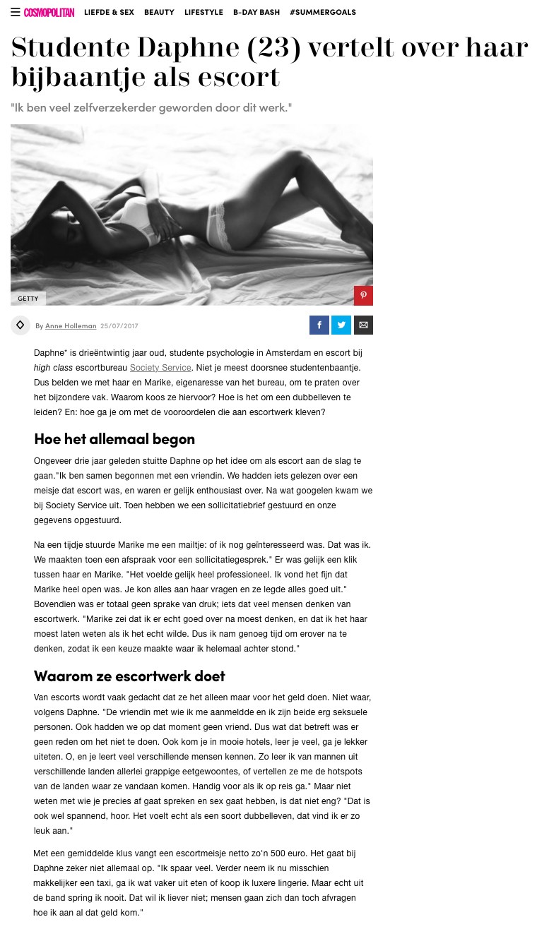 In July 2017 the Dutch Cosmopolitan published an online article on working as a high class escort during your studies. This interview was condoned for the section Love & Sex. Daphne, a high class escort at Society Service and university student was interviewed. The article was published in Dutch but below you can find a short summary in English.