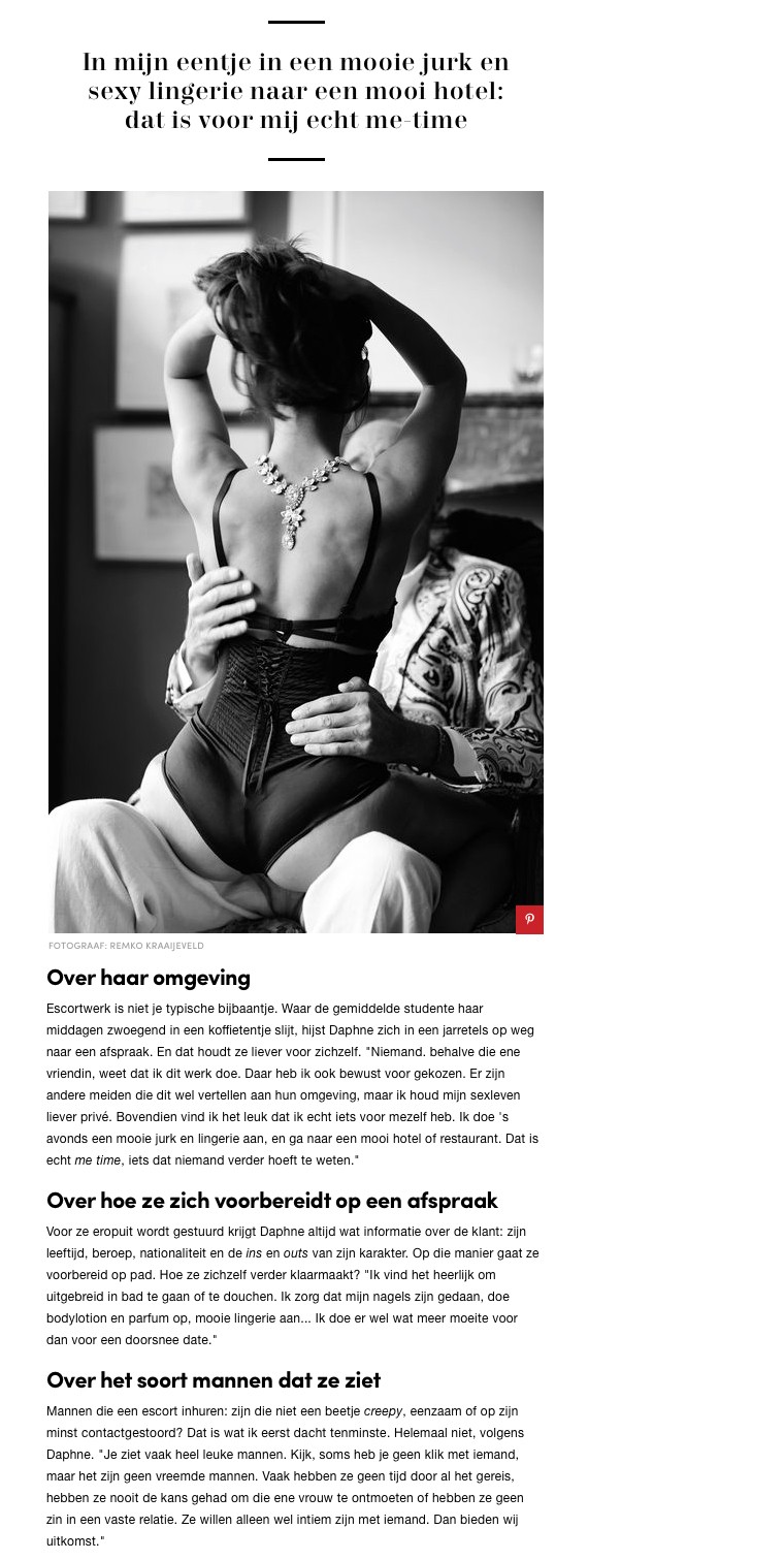 Escortwork is not your typical job. The average student works day in day out at some restaurant. But Daphne puts on her stockings and works as an escort. And she prefers to keep this to herself. "Nobody, aside from one friend, knows I am working as an escort. It's a choice I made consciously. There are other girls who share this with the people around them, but I prefer to keep my sex life private. In addition, I like having something to myself. In the evening I put on a nice dress and lingerie and go to a beautiful hotel or restaurant. It's me time, something nobody else has to know."
