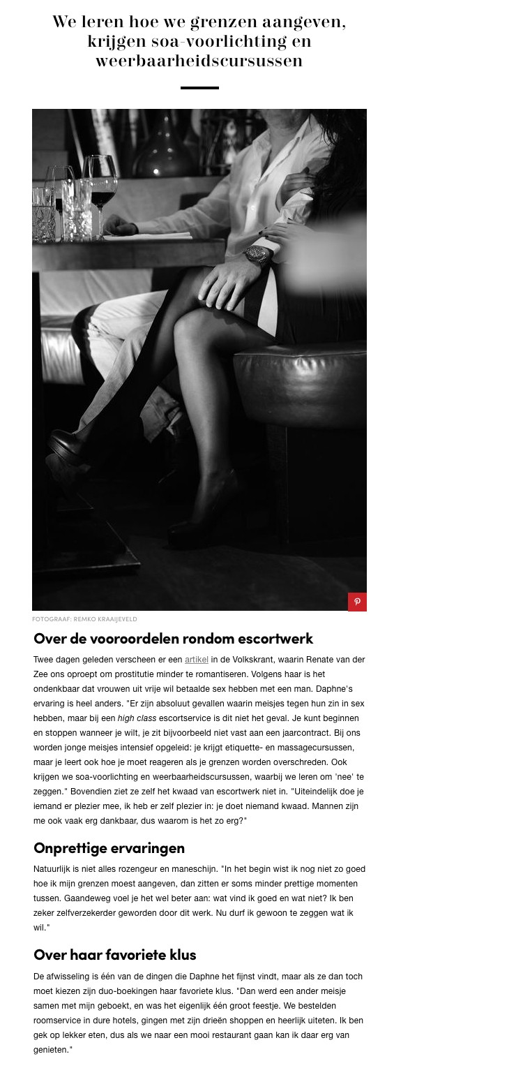 A few days ago an article appeared in de Volkskrant (Dutch newspaper), in which a Dutch lady called Renate told us to no longer romanticize prostitution. According to her, it is impossible for women to have sex for money with a man out of free wil. However, Daphne's experience is very different. "There are absolutely scenarios in which girls have sex against their wishes, but not at a high class escortservice. You can start and stop whenever you want, you are not bound by an annual contract. Ladies are extensively trained; from etiquette- and massage courses to how to respond when boundaries are about to be crossed. In addition to that we are taught about STD's and vulnerability, during which we learn how to say 'no'." Neither does Daphne see anything wrong with what she does. "At the end of the day, you are providing pleasure to an other person, and I am having fun as well. I am not hurting anybody. Men are often very grateful, so why would this be so terrible?"