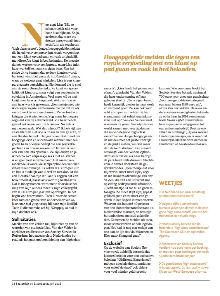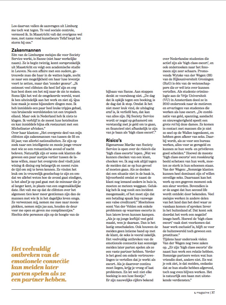 On July 23rd of 2015, L Magazine of newspaper De Limburger published an article on students working as an escort. Owner Marike and a high class escort by Society Service where interviewed for it. The original article was published in Dutch but an English translation can be found below.