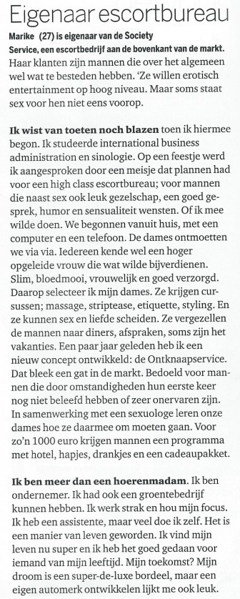 Marike (27) owns Society Service, an exclusive escort agency. Her clients are men who, on average, have some money to spent. "They want erotic entertainment of higher quality. But sometimes sex isn't even the most important thing".