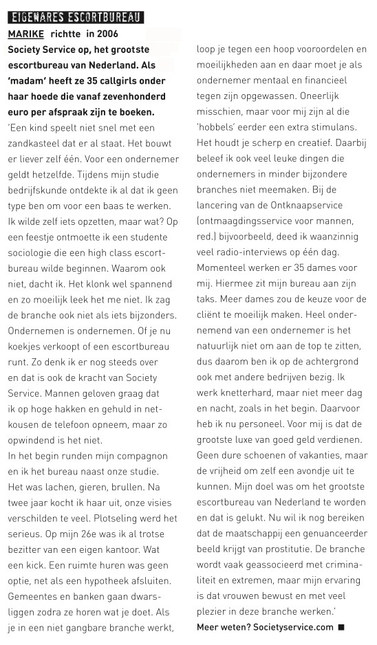 On March 19th, 2014 the Dutch magazine Flair published an article on 3 Dutch female successful entrepreneurs. Founder and owner Marike was listed for successfully running high class escortservice Society Service. The article was published in Dutch but below you can find a short summary in English.
