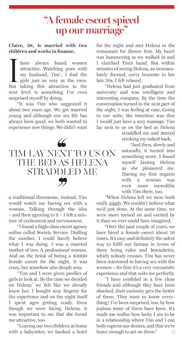 In november 2014 the Australian Marie Claire published an article on women using escort services. A female client of Society Service has been interviewed. In this article, a female client and her husband (a couple) invited a bisexual high class escort for a threesome. The interview is part of a series on women paying for sex. Read and view the article here: