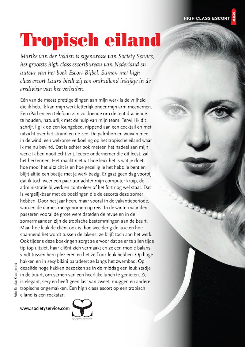 Marike van der Velden is owner of Society Service, the largest high class escortbureau of The Netherlands and author of book Escort Bijbel. Together with high class escort Laura she offers a revealing glimpse into the premier league of seduction.