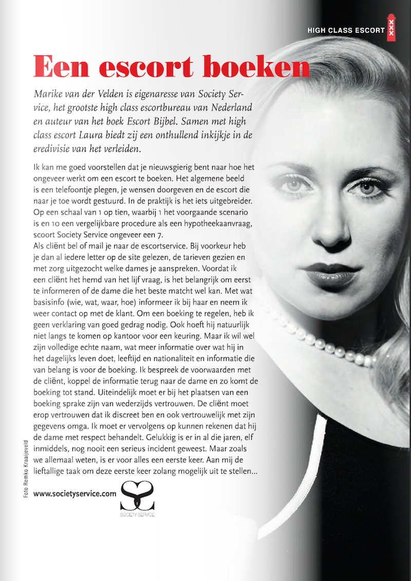 Marike van der Velden is owner of Society Service, the largest high class escortbureau of The Netherlands and author of book Escort Bijbel. Together with high class escort Laura she offers a revealing glimpse into the premier league of seduction.