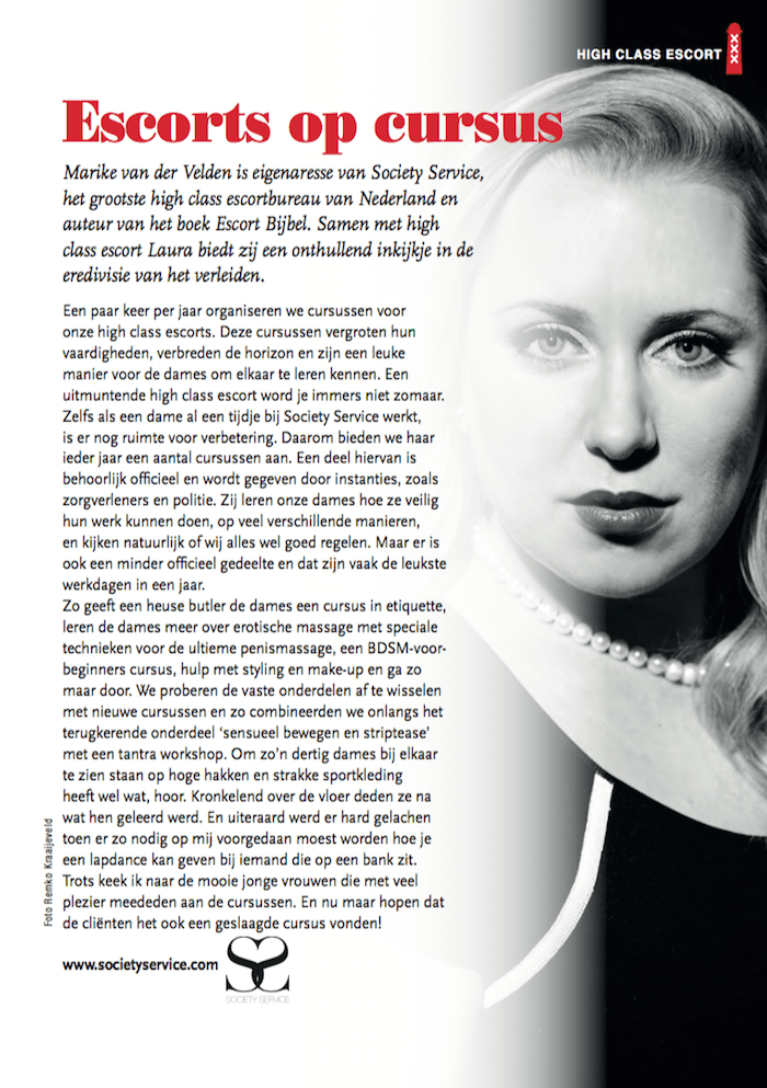 Marike van der Velden is owner of Society Service, the largest high class escortbureau of The Netherlands and author of book Escort Bijbel. Together with high class escort Laura she offers a revealing glimpse into the premier league of seduction.