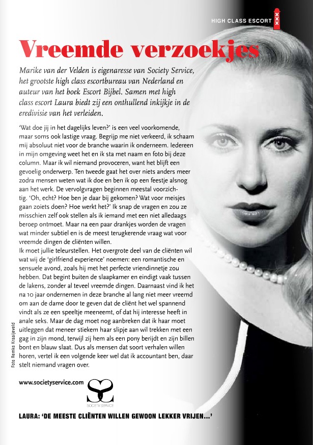 Marike van der Velden is owner of Society Service, the largest high class escortbureau of The Netherlands and author of book Escort Bijbel. Together with high class escort Laura she offers a revealing glimpse into the premier league of seduction.