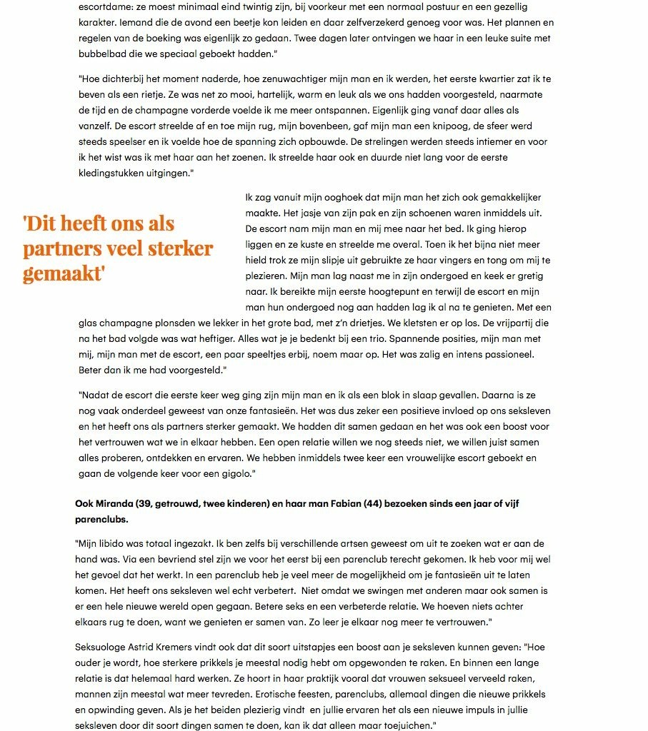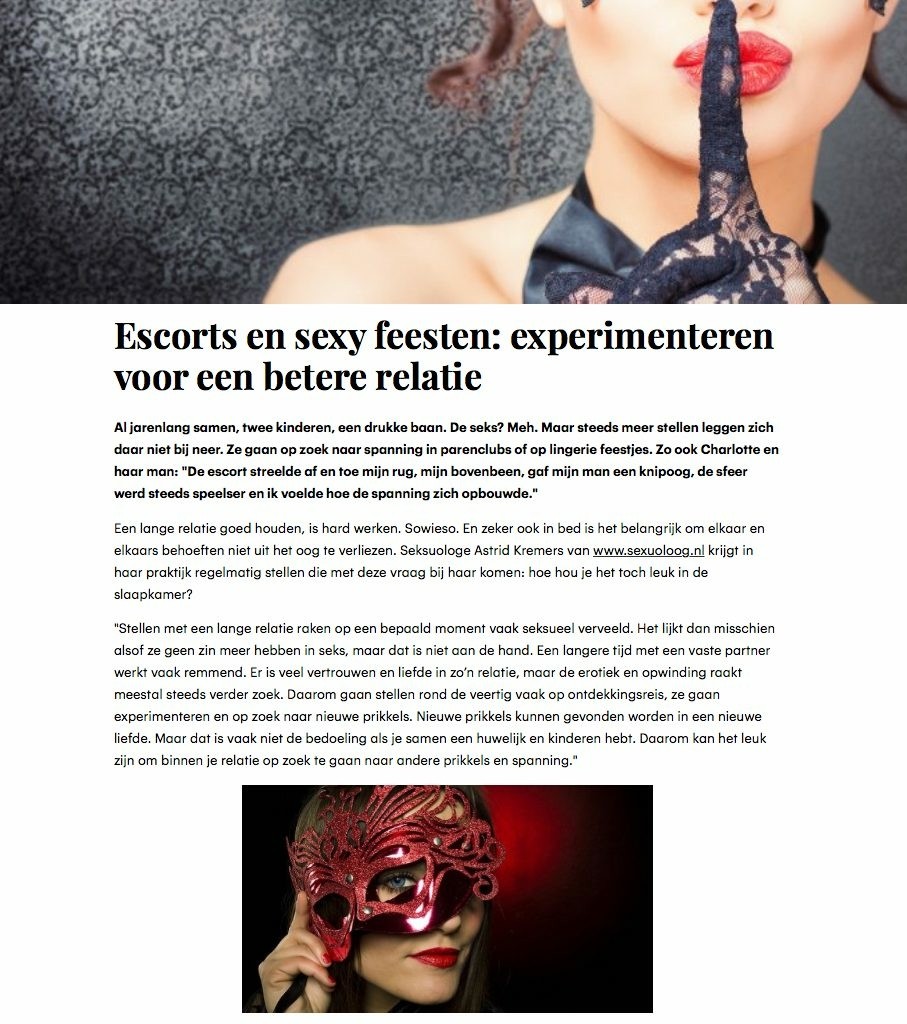 In September 2017 RTL Weekend Magazine from The Netherlands published an article on their website on how to spice things up in te bedroom. Several options where offered, from visiting an erotic party to booking a high class escort for a bisexual threesome. The article was published in Dutch but below you can find a summary in English.