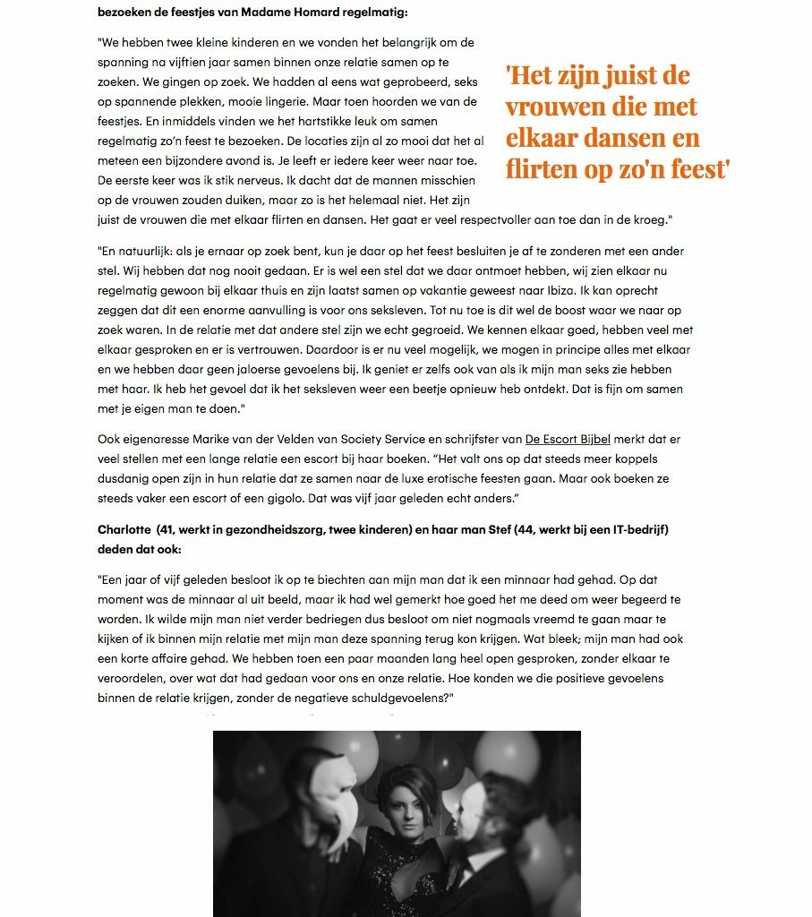 Marike van der Velden, owner of Society Service and author of the book Escort Bijbel have also experienced more and more couples in a long term relationship booking with her. "We can really notice more and more couples being open in their relationship and enjoying luxurious parties together. But they also book escorts and gigolos. That was very different five years ago.”