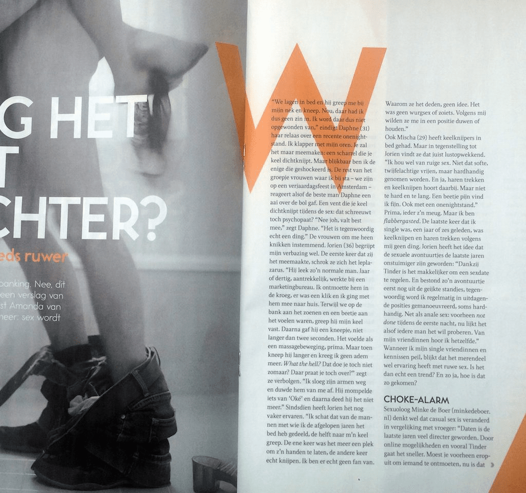 “We where laying on the bed and he groped me by my nek and squeezed it. I was not up for that, it does not excite me." tells Daphne (31) about a recent one night stand. I can not believe what I am hearing. Imagine a person you just met chocking you. But looks like I am the only one in shock. The rest of the group of women in my company - at a birthday party in Amsterdam - respond like Daphne's guy did noting weird. A guy chocking you during sex, doesn't that scream psychopath? "No, it's nothing like that", tells Daphne. "Nowadays it's really a trend." The women all agree. Jorien 36) understands my amazement. The first time she experienced anything like that, she was shocked as well. "He looked like such a normal guy, in his thirties, attractive, working as a marketeer. I met him in a bar, we hit it of so I went home with him. While kissing on the couch, touching each other a bit, he grabbed my throat. He squeezed it a little, no longer than a few seconds. It felt like massaging so fine. But then he squeezed longer so I couldn't breathe any more. What the hell? You don't do that without talking about it. I pulled away his arms and pushed him off me. He mumbled something like "okay" and didn't do it again." This is not the only experience of this kind for Jorien. "I think about a third of the men I've been with in the past few years have groped me by my throat. Sometimes just as a place to rest his hands, the other times to really choke. I am not a fan of it. I don't know why they did it, it was not like we where practicing breath play. I guess they just wanted to push or keep me in a position."