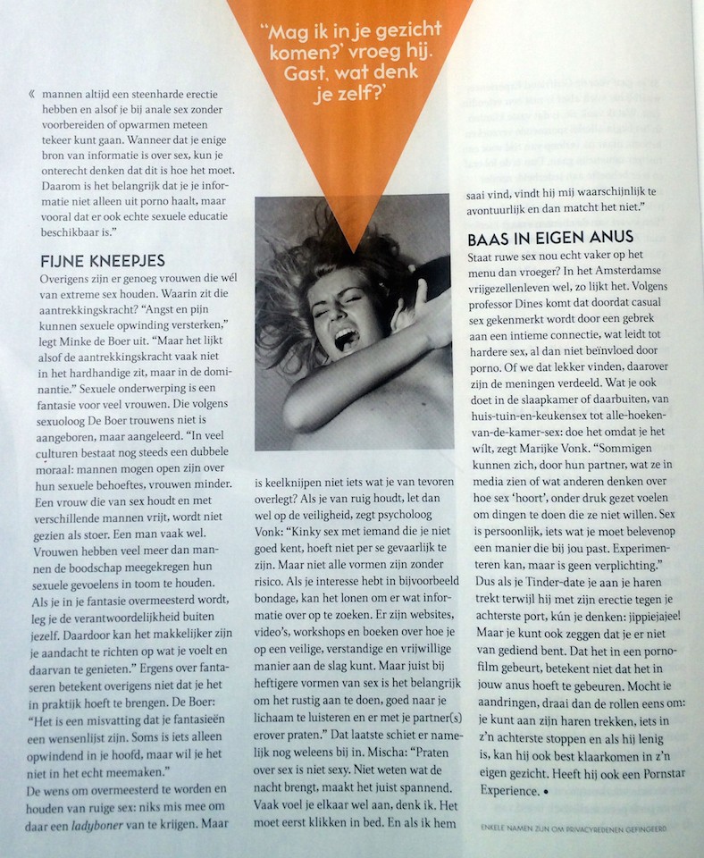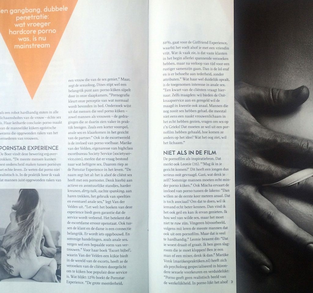 On March 2nd 2016, magazine Viva published a piece on the new trend "Men want rough sex." Owner Marike was interviewed about how many clients are requesting more rough sex, which with an escort is called the Pornstar Experience (PSE) The original article was published in Dutch but an English translation can be found below.