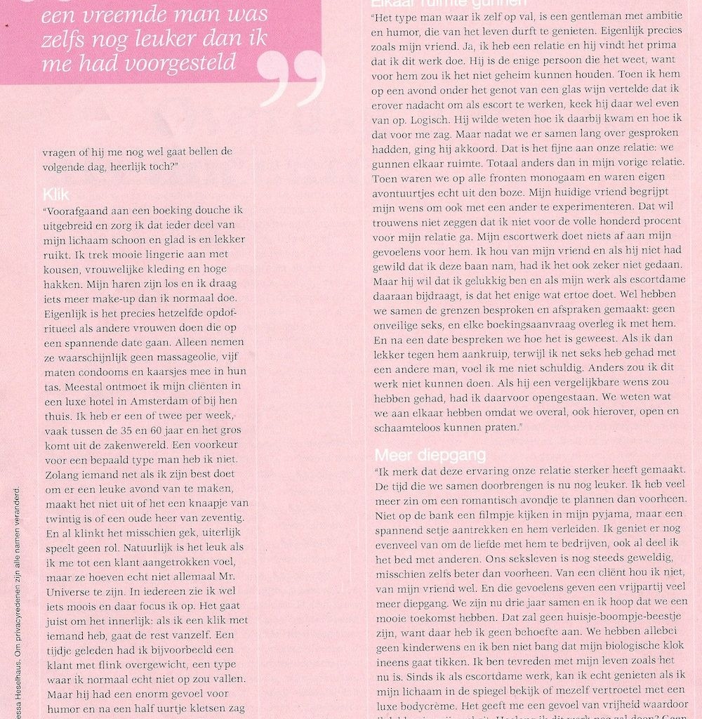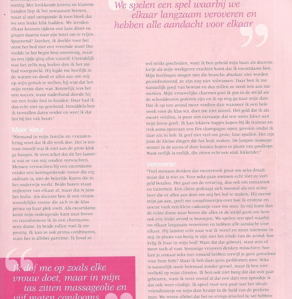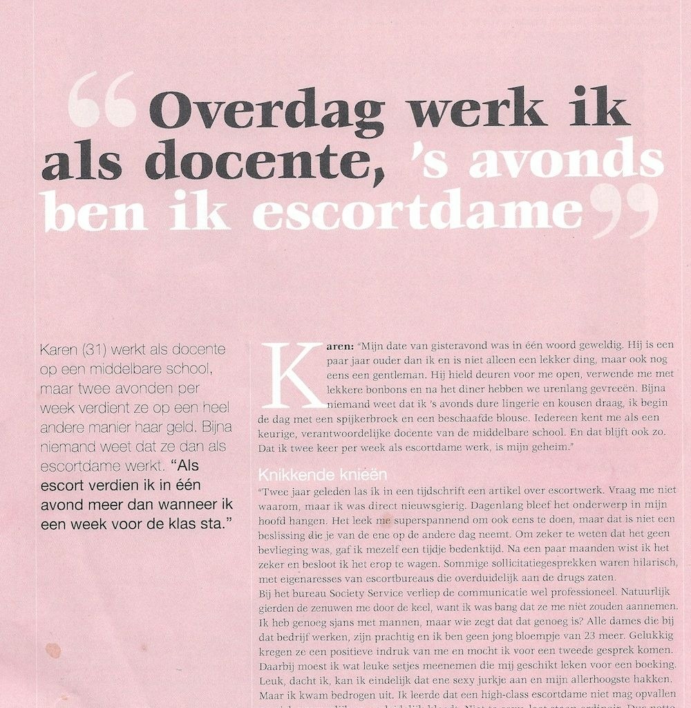 On august 21st, 2013 the Dutch magazine Vriendin published an article about working as an high class escort at Society Service in the candid department. In this article, Karen (alias) is being interviewed, who works for Society Service. She talks about what it's like to work as an high class escort and how she combines this with her day to day life. The article was published in Dutch but below you can find a short summary in English.