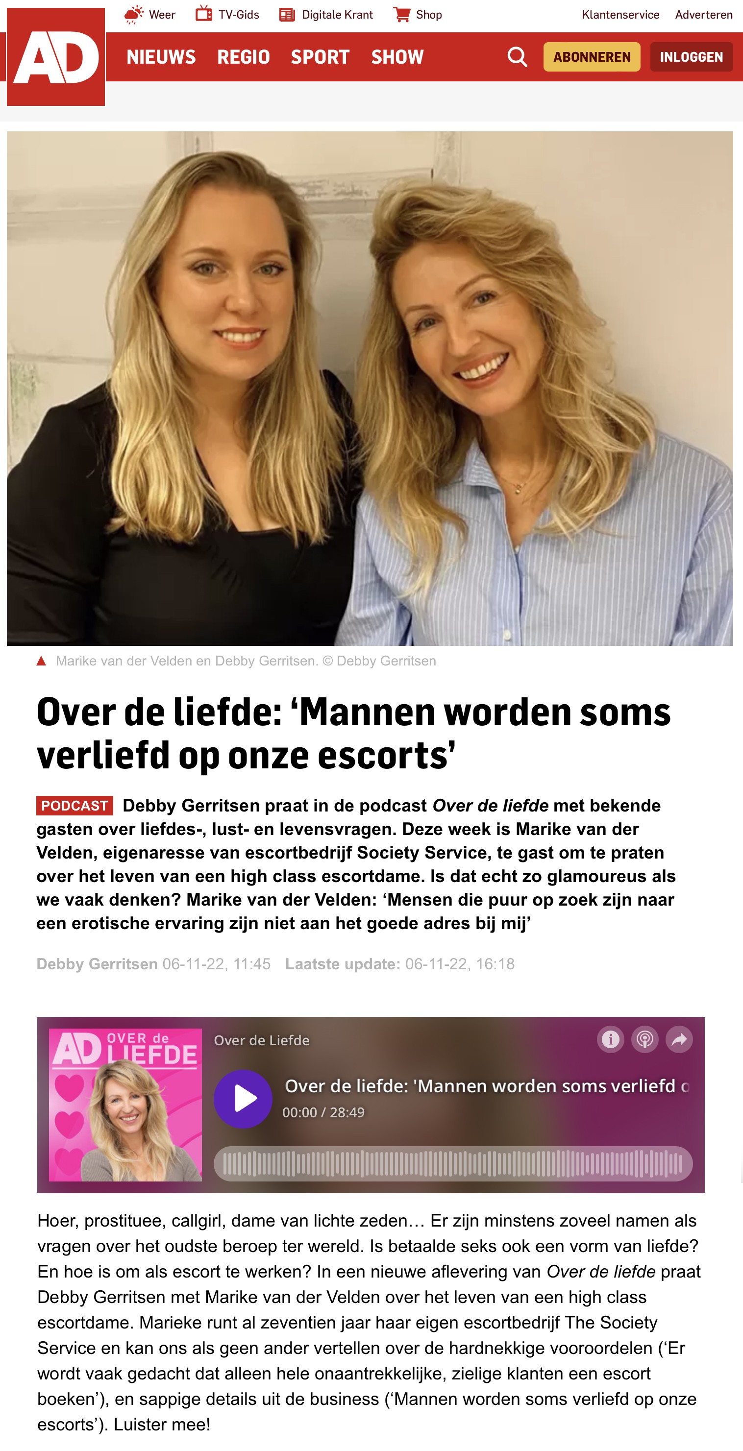 Op 6 november 2022 publiceerde landelijk dagblad het AD een podcast in de serie "Over de liefde" van Debby Gerritsen. Deze keer schuift eigenaresse Marike van Society Service aan bij Debby en praten zij over hoe het is om een escortservice te runnen. Onder andere vertelt Marike over clienten die wel eens verliefd worden op de escorts, en waarom dat gebeurt. U kunt de originele publicatie hier terugvinden en de podcast hier terugluisteren. Daarnaast vindt u hierbeneden een globaal transcript.