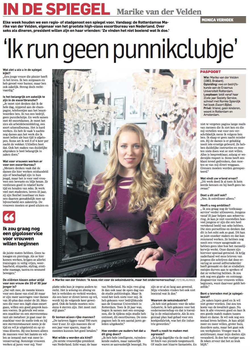 Op 29 oktober 2015 publiceerde Algemeen Dagblad Rotterdam een artikel in rubriek "de spiegel" over de Rotterdamse zakenvrouw Marike, eigenaar van het grootste high-class escortbureau van Nederland. Lees en bekijk het artikel hier.