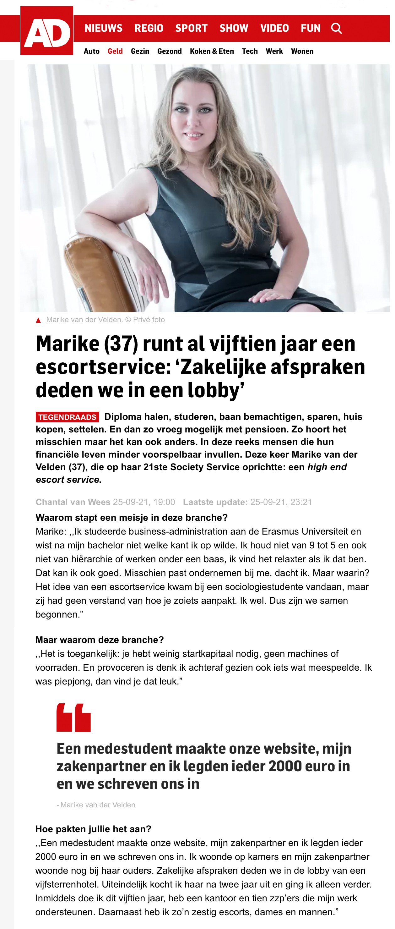 Op 25 september publiceerde het Algemeen Dagblad een artikel op hun website in de rubriek "Tegendraads" over eigenaresse Marike die een escortservice exploiteert. In de rubriek komen personen aan het woord die hun leven op een andere manier inrichten dan gangbaar is. Marike vertelt over het opzetten van een escortservice en de consequenties die dit heeft voor haar leven. U kunt het artikel hier beneden zien en lezen.