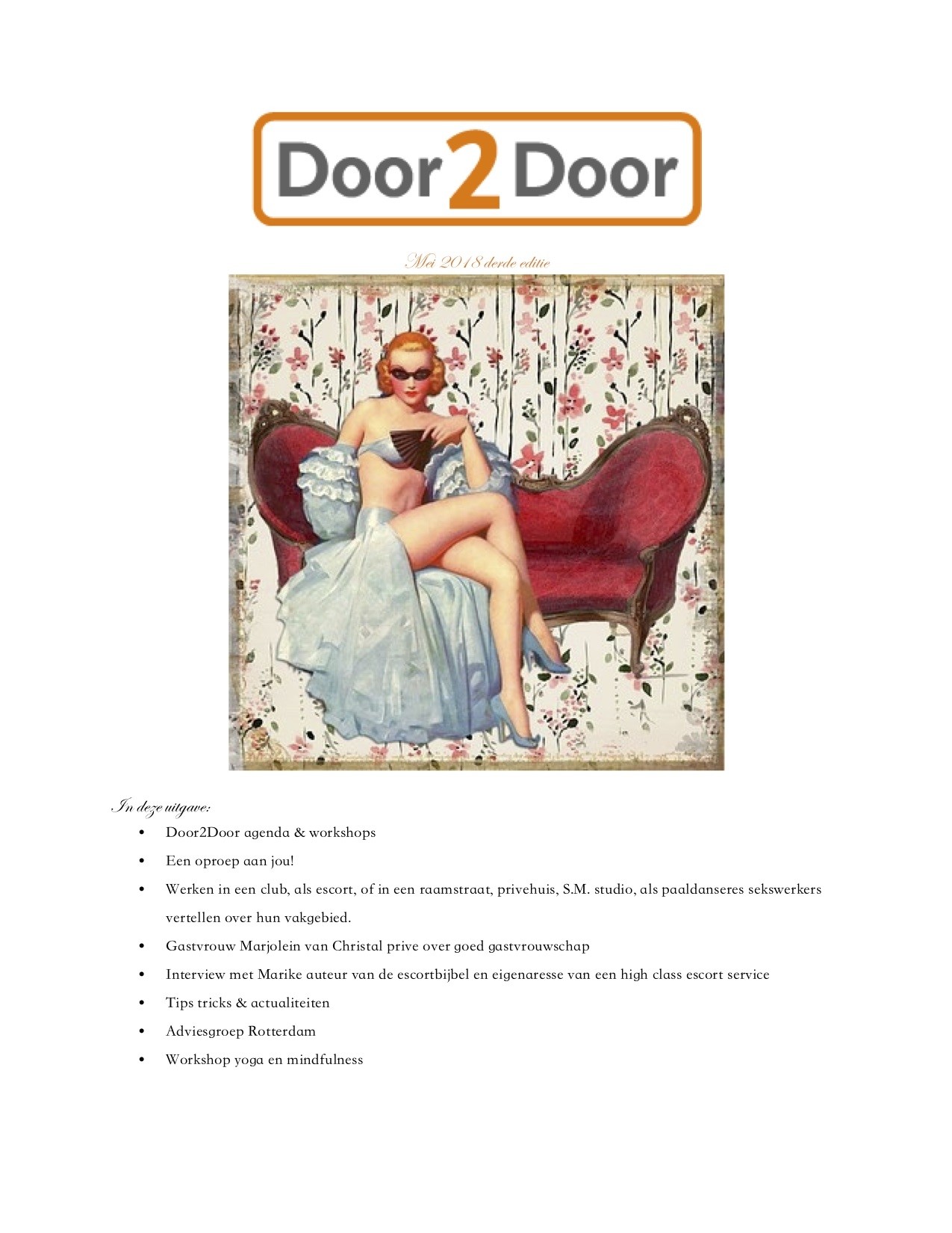 In mei 2018 publiceerde Door2Door in hun magazine een artikel over Marike, eigenaresse van high class escortservice Society Service in Rotterdam. Door2Door is een informatie- en dienstencentrum voor en door sekswerkers die werken of wonen in regio Rotterdam. Door2Door ziet prostitutie als een vak en wil met dit centrum, waar enthousiaste vrijwilligers werken, een bijdrage leveren aan de positieverbetering van sekswerkers. Bekijk en lees het artikel hier of op de website van Door2Door.