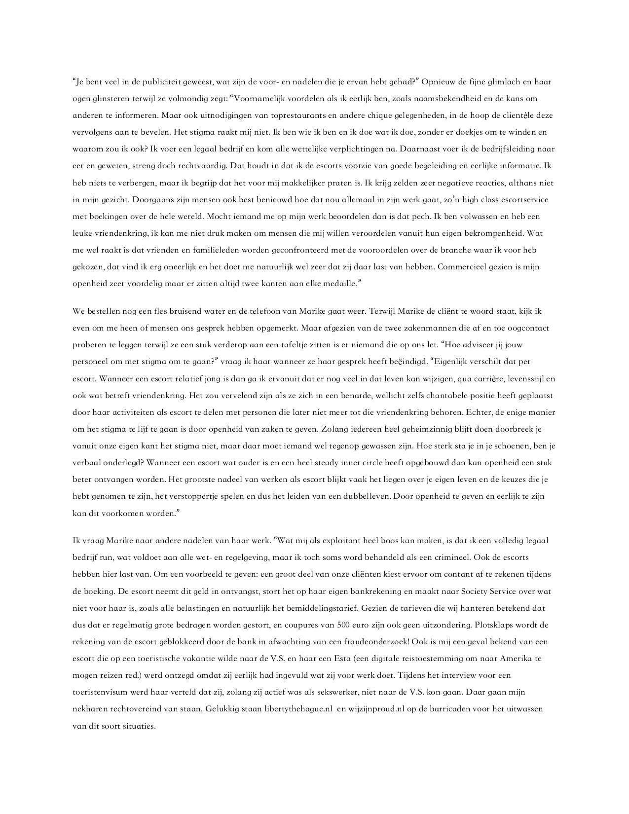 We bestellen nog een fles bruisend water en de telefoon van Marike gaat weer. Terwijl Marike de cliënt te woord staat, kijk ik even om me heen of mensen ons gesprek hebben opgemerkt. Maar afgezien van de twee zakenmannen die af en toe oogcontact proberen te leggen terwijl ze een stuk verderop aan een tafeltje zitten is er niemand die op ons let. “Hoe adviseer jij jouw personeel om met stigma om te gaan?” vraag ik haar wanneer ze haar gesprek heeft beëindigd. “Eigenlijk verschilt dat per escort. Wanneer een escort relatief jong is dan ga ik ervanuit dat er nog veel in dat leven kan wijzigen, qua carrière, levensstijl en ook wat betreft vriendenkring. Het zou vervelend zijn als ze zich in een benarde, wellicht zelfs chantabele positie heeft geplaatst door haar activiteiten als escort te delen met personen die later niet meer tot die vriendenkring behoren. Echter, de enige manier om het stigma te lijf te gaan is door openheid van zaken te geven. Zolang iedereen heel geheimzinnig blijft doen doorbreek je vanuit onze eigen kant het stigma niet, maar daar moet iemand wel tegenop gewassen zijn. Hoe sterk sta je in je schoenen, ben je verbaal onderlegd? Wanneer een escort wat ouder is en een heel steady inner circle heeft opgebouwd dan kan openheid een stuk beter ontvangen worden. Het grootste nadeel van werken als escort blijkt vaak het liegen over je eigen leven en de keuzes die je hebt genomen te zijn, het verstoppertje spelen en dus het leiden van een dubbelleven. Door openheid te geven en eerlijk te zijn kan dit voorkomen worden.”