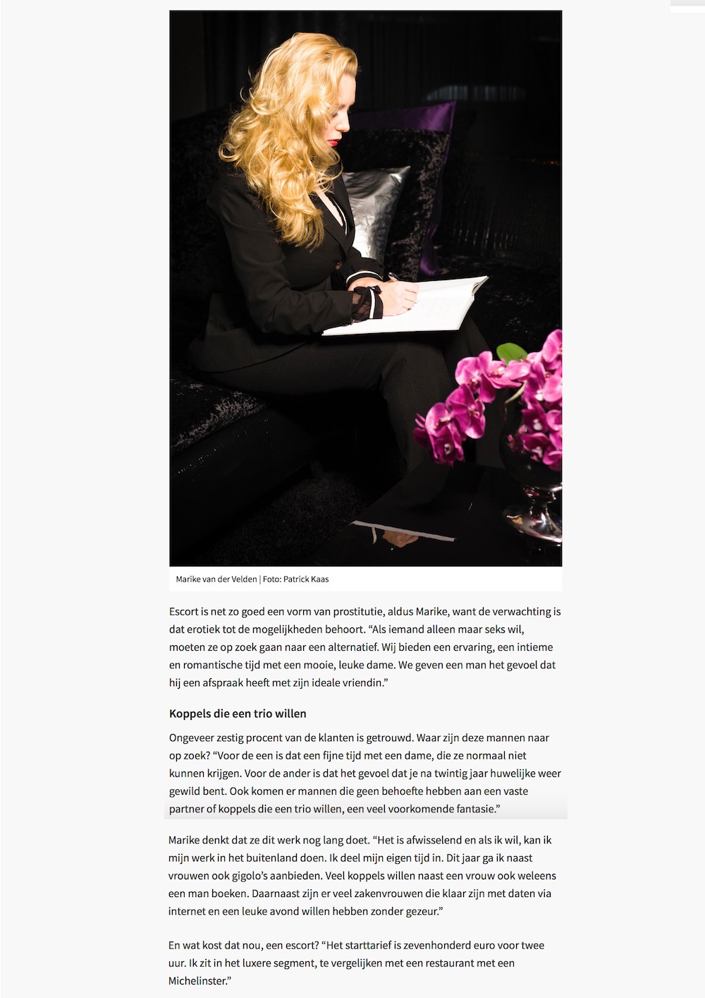 Ongeveer zestig procent van de klanten is getrouwd. Waar zijn deze mannen naar op zoek? “Voor de een is dat een fijne tijd met een dame, die ze normaal niet kunnen krijgen. Voor de ander is dat het gevoel dat je na twintig jaar huwelijke weer gewild bent. Ook komen er mannen die geen behoefte hebben aan een vaste partner of koppels die een trio willen, een veel voorkomende fantasie.” Marike denkt dat ze dit werk nog lang doet. “Het is afwisselend en als ik wil, kan ik mijn werk in het buitenland doen. Ik deel mijn eigen tijd in. Dit jaar ga ik naast vrouwen ook gigolo’s aanbieden. Veel koppels willen naast een vrouw ook weleens een man boeken. Daarnaast zijn er veel zakenvrouwen die klaar zijn met daten via internet en een leuke avond willen hebben zonder gezeur.” En wat kost dat nou, een escort? “Het starttarief is zevenhonderd euro voor twee uur. Ik zit in het luxere segment, te vergelijken met een restaurant met een Michelinster.”