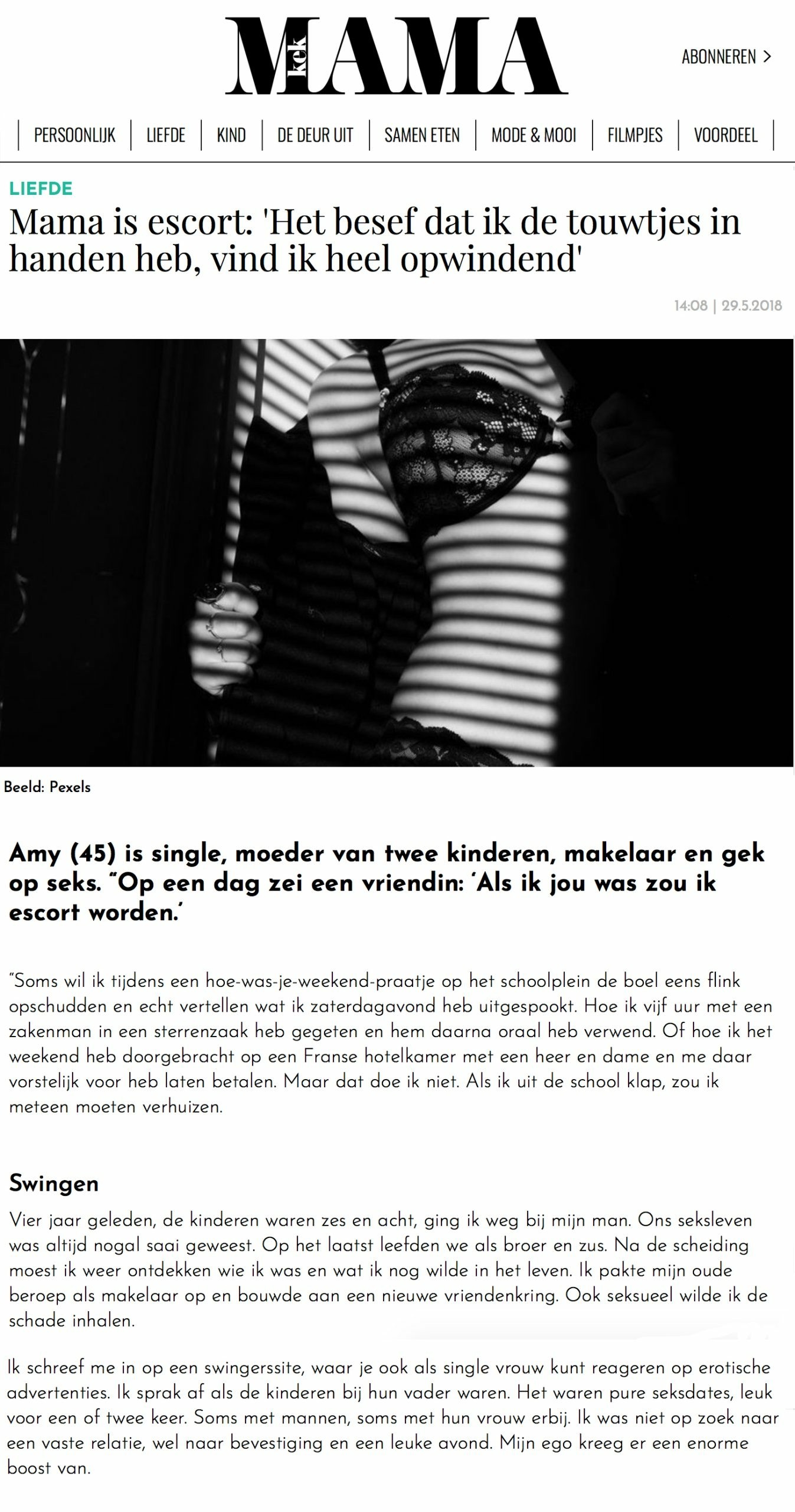 Op 29 mei publiceerde Kek Mama een artikel over hoe een oudere en rijpere vrouw haar privé-leven combineert met het werken als high class escort. In dit artikel wordt Amy geïnterviewd, die inmiddels niet meer beschikbaar is als escort. Bekijk en lees het artikel hier of op de website van Kek Mama.