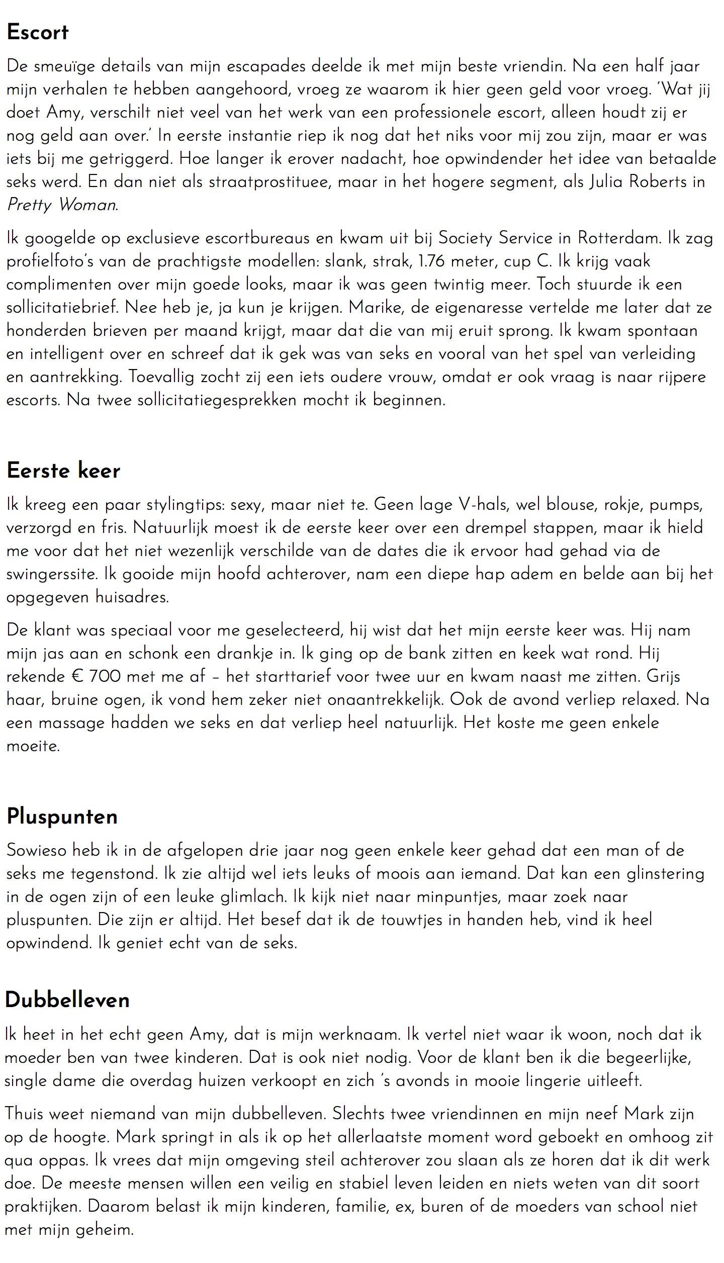 “Soms wil ik tijdens een hoe-was-je-weekend-praatje op het schoolplein de boel eens flink opschudden en echt vertellen wat ik zaterdagavond heb uitgespookt. Hoe ik vijf uur met een zakenman in een sterrenzaak heb gegeten en hem daarna oraal heb verwend. Of hoe ik het weekend heb doorgebracht op een Franse hotelkamer met een heer en dame en me daar vorstelijk voor heb laten betalen. Maar dat doe ik niet. Als ik uit de school klap, zou ik meteen moeten verhuizen.