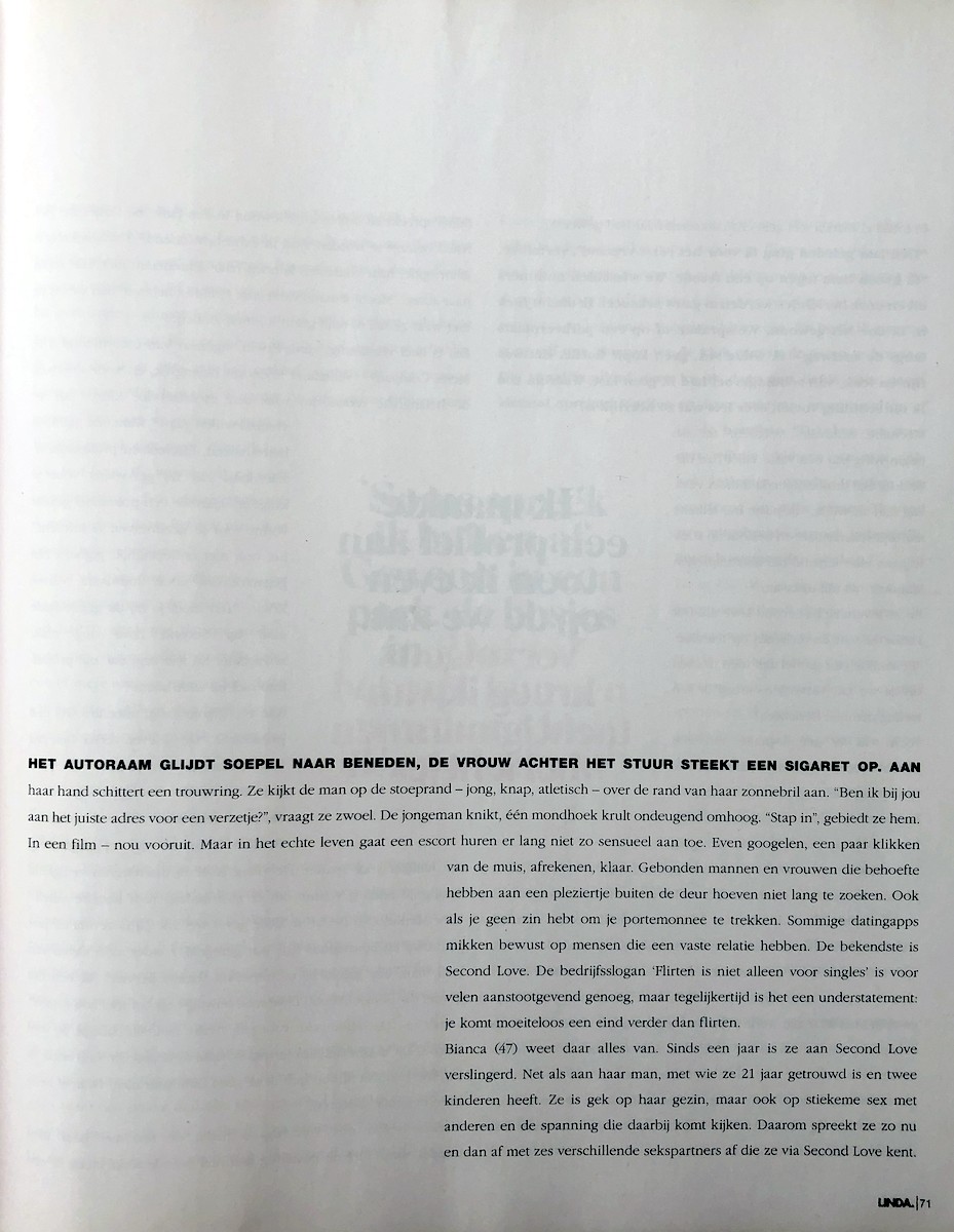 Het autoraam glijdt soepel naar beneden, de vrouw achter het stuur steekt een sigaret op. Aan haar hand schittert een trouwring. Ze kijkt de man op de stoeprand – jong, knap, atletisch – over de rand van haar zonnebril aan. “Ben ik bij jou aan het juiste adres voor een verzetje?”, vraagt ze zwoel. De jongeman knikt, één mondhoek krult ondeugend omhoog. “Stap in”, gebiedt ze hem. In een film – nou vooruit. Maar in het echte leven gaat een escort huren er lang niet zo sensueel aan toe. Even googelen, een paar klikken van de muis, afrekenen, klaar. Gebonden mannen en vrouwen die behoefte hebben aan een pleziertje buiten de deur hoeven niet lang te zoeken. Ook als je geen zin hebt om je portemonnee te trekken. Sommige datingapps mikken bewust op mensen die een vaste relatie hebben. De bekendste is Second Love. De bedrijfsslogan ‘Flirten is niet alleen voor singles’ is voor velen aanstootgevend genoeg, maar tegelijkertijd is het een understatement: je komt moeiteloos een eind verder dan flirten.