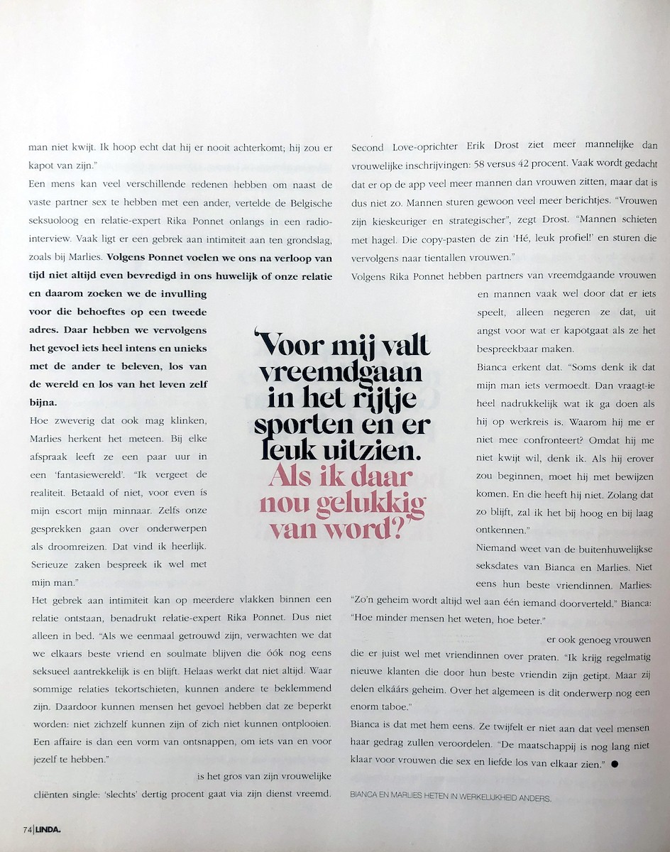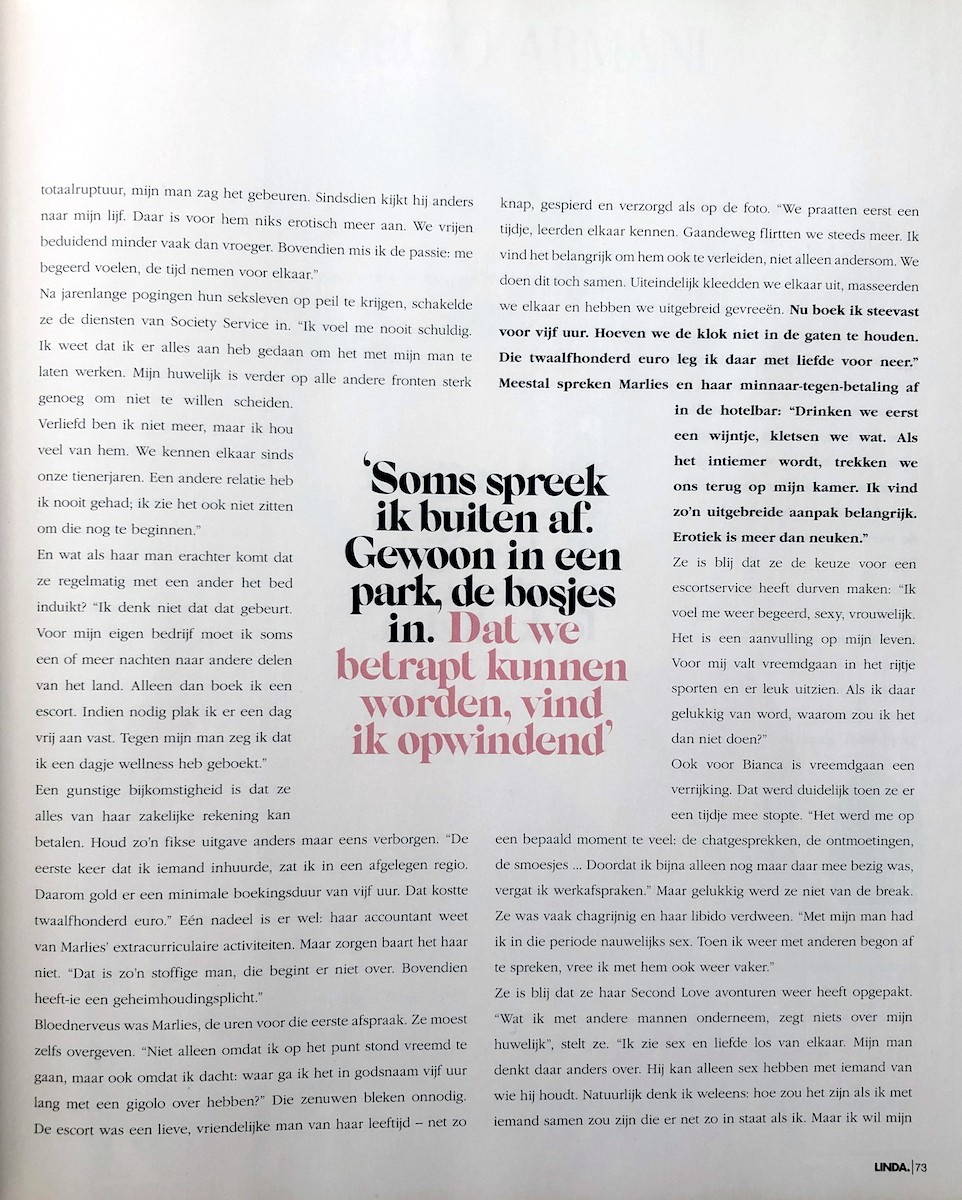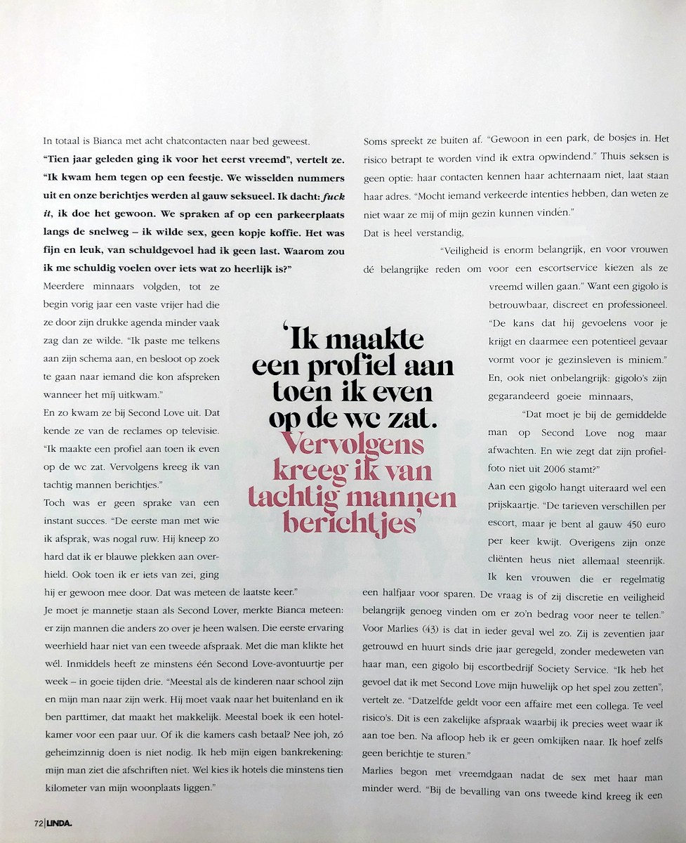 Op 1 mei publiceerde Linda Magazine een groot artikel over een vrouw die afspreekt met de gigolo's van onze escortservice. In het artikel vertelt de cliënte hoe zij gebruik maakt van de diensten van een gigolo terwijl zij getrouwd is. In het artikel komen meerdere vrouwen aan het woord die vreemdgaan op verschillende manieren. Zij vertellen wat hen motiveert en hoe ze zich hierbij voelen. Lees en bekijk het artikel hier.