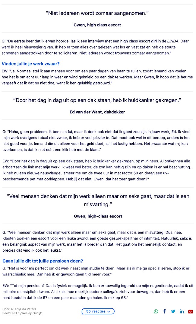 Op 11 juni publiceerde Nu.nl een interview met een high class escort van Society Service in de vaste rubriek "Wat verdient het". De high class escort en een dakdekker vergelijken hun inkomen en hoe ze hun toekomst zien in het artikel. Lees het artikel op de website van Nu.nl of hier beneden en bekijk het volledige artikel ook.