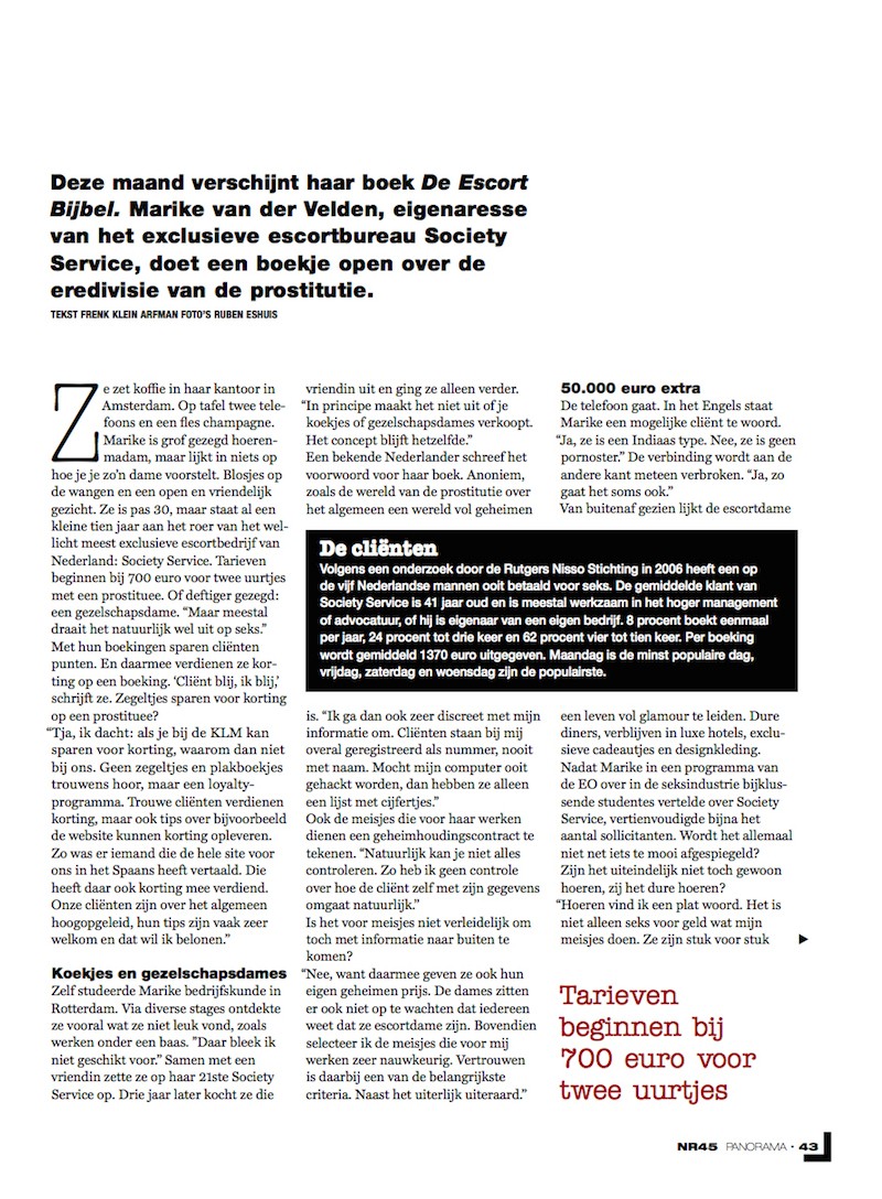 Ze zet koffie in haar kantoor in Amsterdam. Op tafel twee telefoons en een fles champagne. Marike is grof gezegd hoerenmadam, maar lijkt in niets op hoe je je zo’n dame voorstelt. Blosjes op de wangen en een open en vriendelijk gezicht. Ze is pas 30, maar staat al een kleine tien jaar aan het roer van het wellicht meest exclusieve escortbedrijf van Nederland: Society Service. Tarieven beginnen bij 700 euro voor twee uurtjes met een prostituee. Of deftiger gezegd: een gezelschapsdame. “Maar meestal draait het natuurlijk wel uit op seks. ” Met hun boekingen sparen cliënten punten. En daarmee verdienen ze korting op een boeking. ‘Cliënt blij, ik blij, ’ schrijft ze. Zegeltjes sparen voor korting op een prostituee?