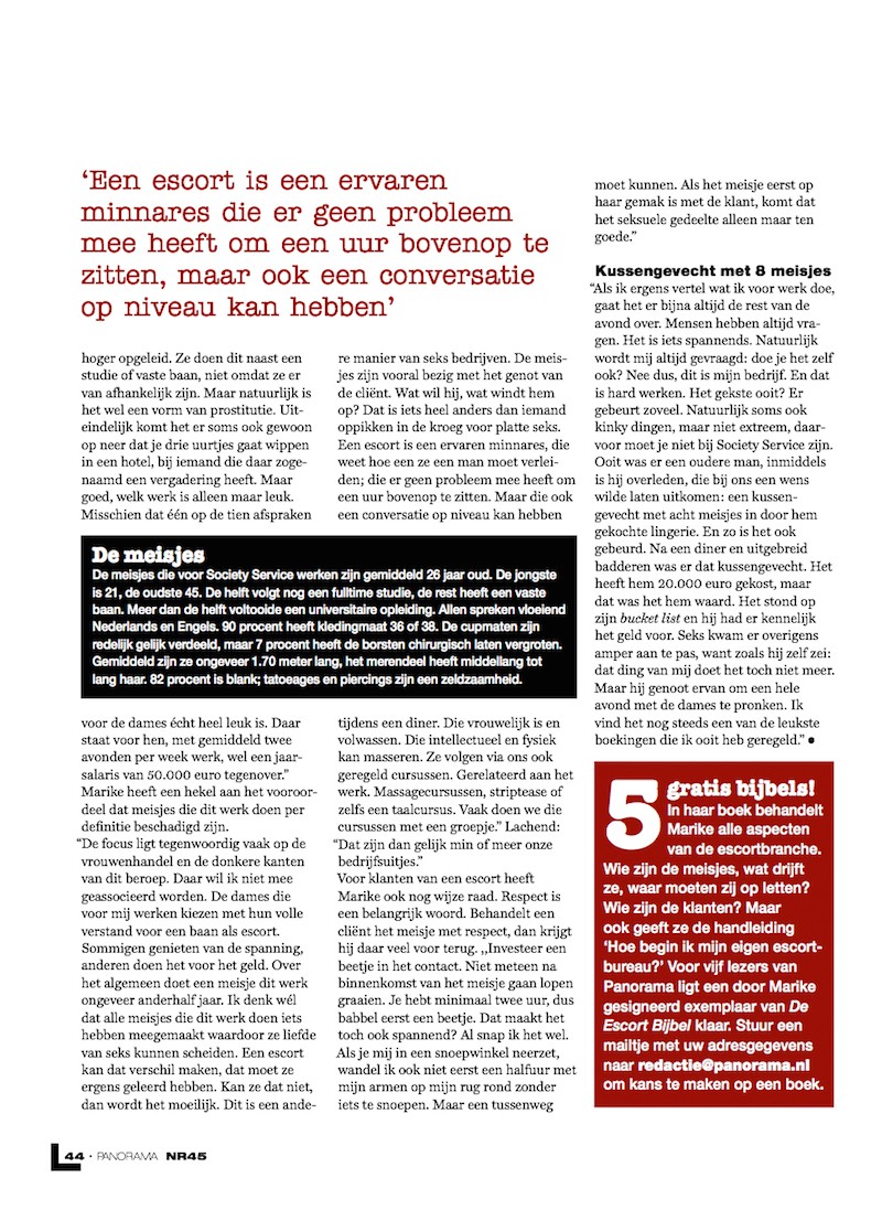 Op 5 November publiceerde magazine Panorama een artikel over de Escort Bijbel. Marike, oprichtster en eigenaar van Society Service high class escortservice was geïnterviewd voor dit artikel in magazine Panorama. Lees en bekijk het artikel hier: