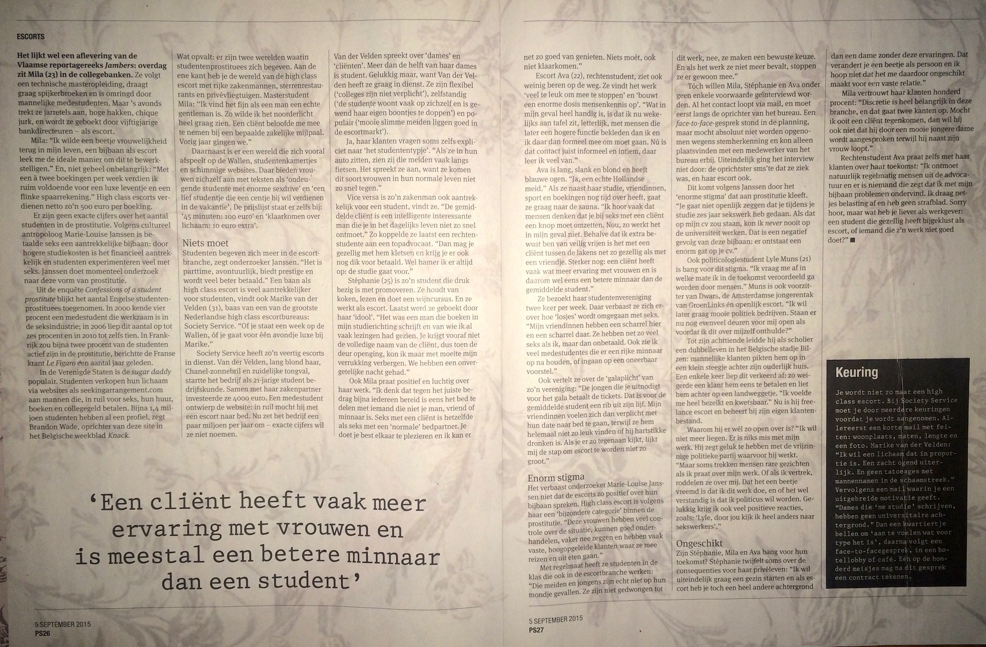 Het lijkt wel een aflevering van de Vlaamse reportagereeks Jambers: overdag zit Mila (23) in de collegebanken. Ze volgt een technische masteropleiding, draagt graag spijkerbroeken en is omringd door mannelijke medestudenten. Maar 's avonds trekt ze jarretels aan, hoge hakken, chique jurk, en wordt ze geboekt door vijftigjarige bankdirecteuren - als escort. Mila: "Ik wilde een beetje vrouwelijkheid terug in mijn leven, een bijbaan als escort leek me de ideale manier om dit te bewerkstelligen." En, niet geheel onbelangrijk: "Met een à twee boekingen per week verdien ik ruim voldoende voor een luxe leventje en een flinke spaarrekening." High class escorts verdienen netto zo'n 500 euro per boeking.Er zijn geen exacte cijfers over het aantal studenten in de prostitutie. Volgens cultureel antropoloog Marie-Louise Janssen is betaalde seks een aantrekkelijke bijbaan: door hogere studiekosten is het financieel aantrekkelijk en studenten experimenteren veel met seks. Janssen doet momenteel onderzoek naar deze vorm van prostitutie. Uit de enquête Confessions of a student prostitute blijkt het aantal Engelse studentenprostituees toegenomen. In 2000 kende vier procent een medestudent die werkzaam is in de seksindustrie; in 2006 liep dit aantal op tot zes procent en in 2010 tot zelfs tien. In Frankrijk zou bijna twee procent van de studenten actief zijn in de prostitutie, berichtte de Franse krant Le Figaro een aantal jaar geleden. In de Verenigde Staten is de sugar daddy populair. Studenten verkopen hun lichaam via websites als seekingarrangement.com aan mannen die, in ruil voor seks, hun huur, boeken en collegegeld betalen. Bijna 1,4 miljoen studenten hebben al een profiel, zegt Brandon Wade, oprichter van deze site in het Belgische weekblad Knack.
