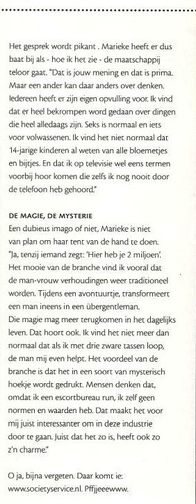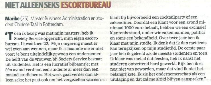 High class escortservice Society Service verscheen in 2009 diverse malen in het nieuws. In dit jaar kocht Marike de mede-oprichtster en mede-eigenaresse uit en ging alleen verder.