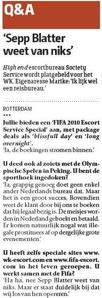 6 Januari: Publicatie in krant De Pers "Fifa 2010 Escort Special"