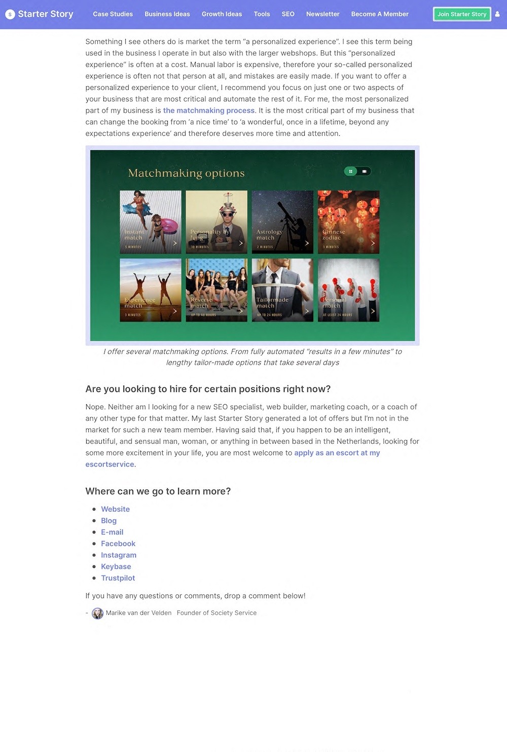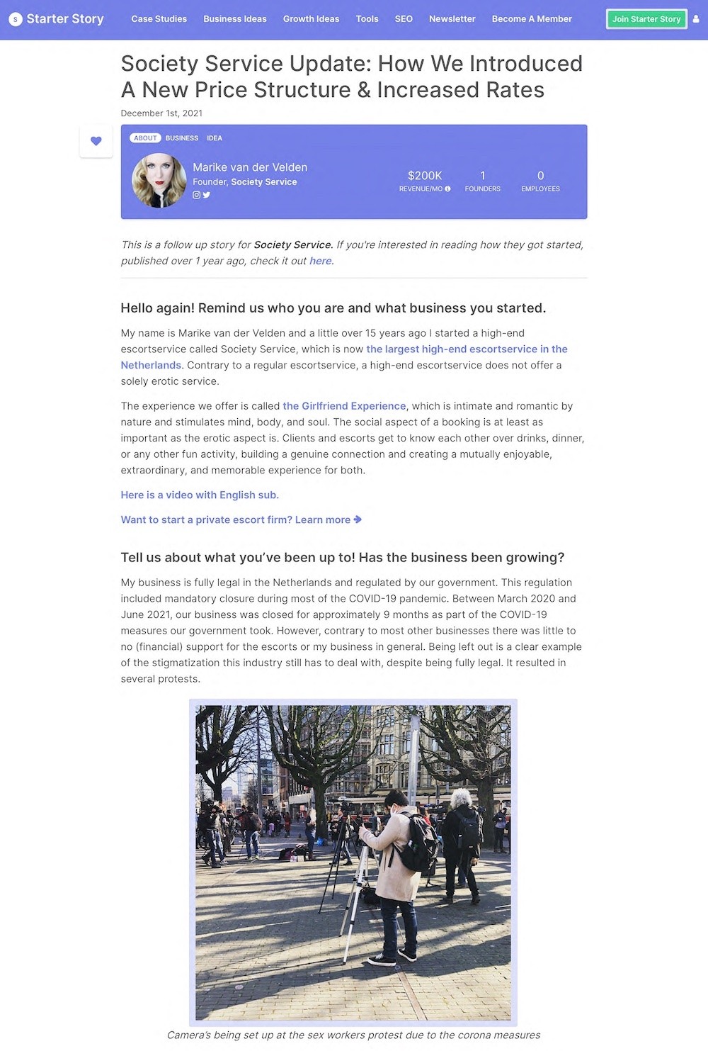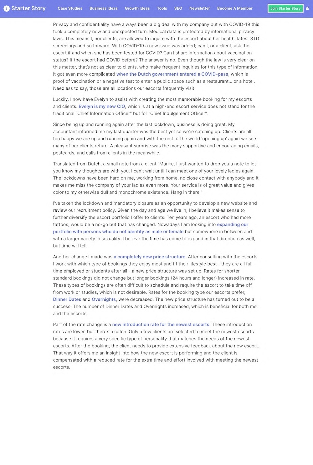 Op 5 oktober 2020 publiceerde Starter Story een case study over onze high class escortservice. Starter Story is een online platform waar succesvolle ondernemers worden geïnterviewd en de verhalen achter hun bedrijf delen. Ruim een jaar later vroeg Starter Story ons om een update te geven over onze high-end escortservice. Het interview is in het Engels te vinden op de website van Starter Story en een vertaling is hieronder te lezen.