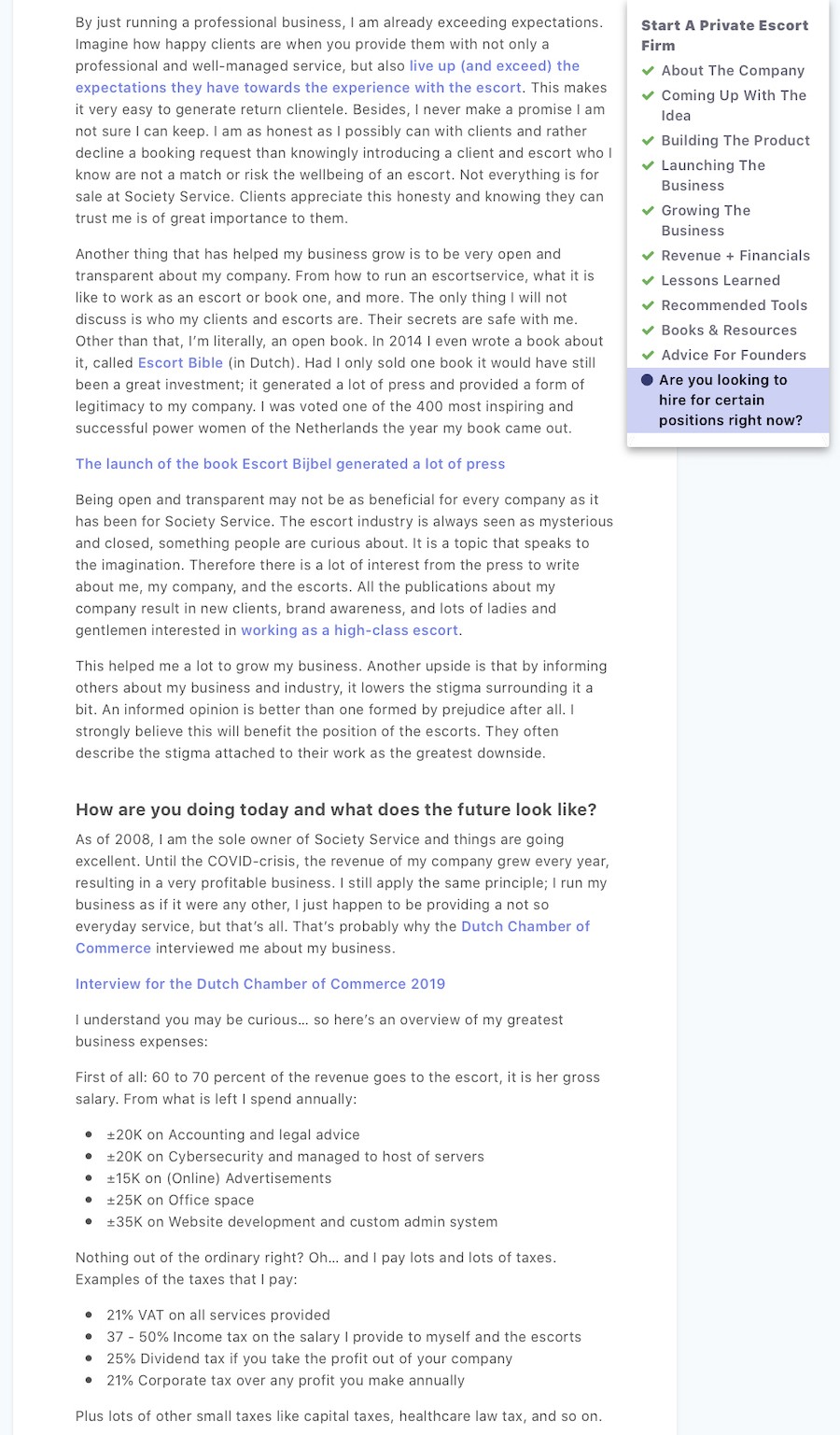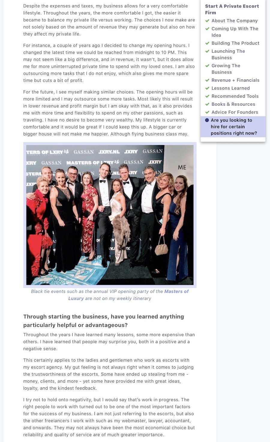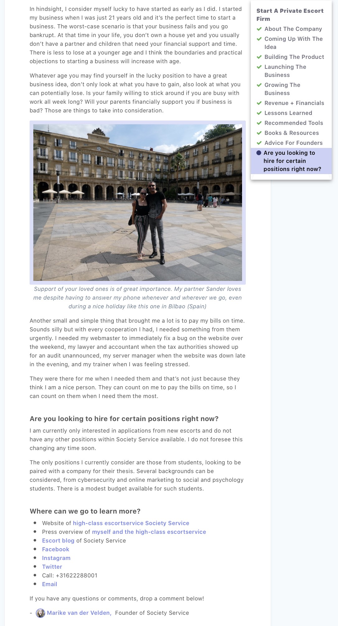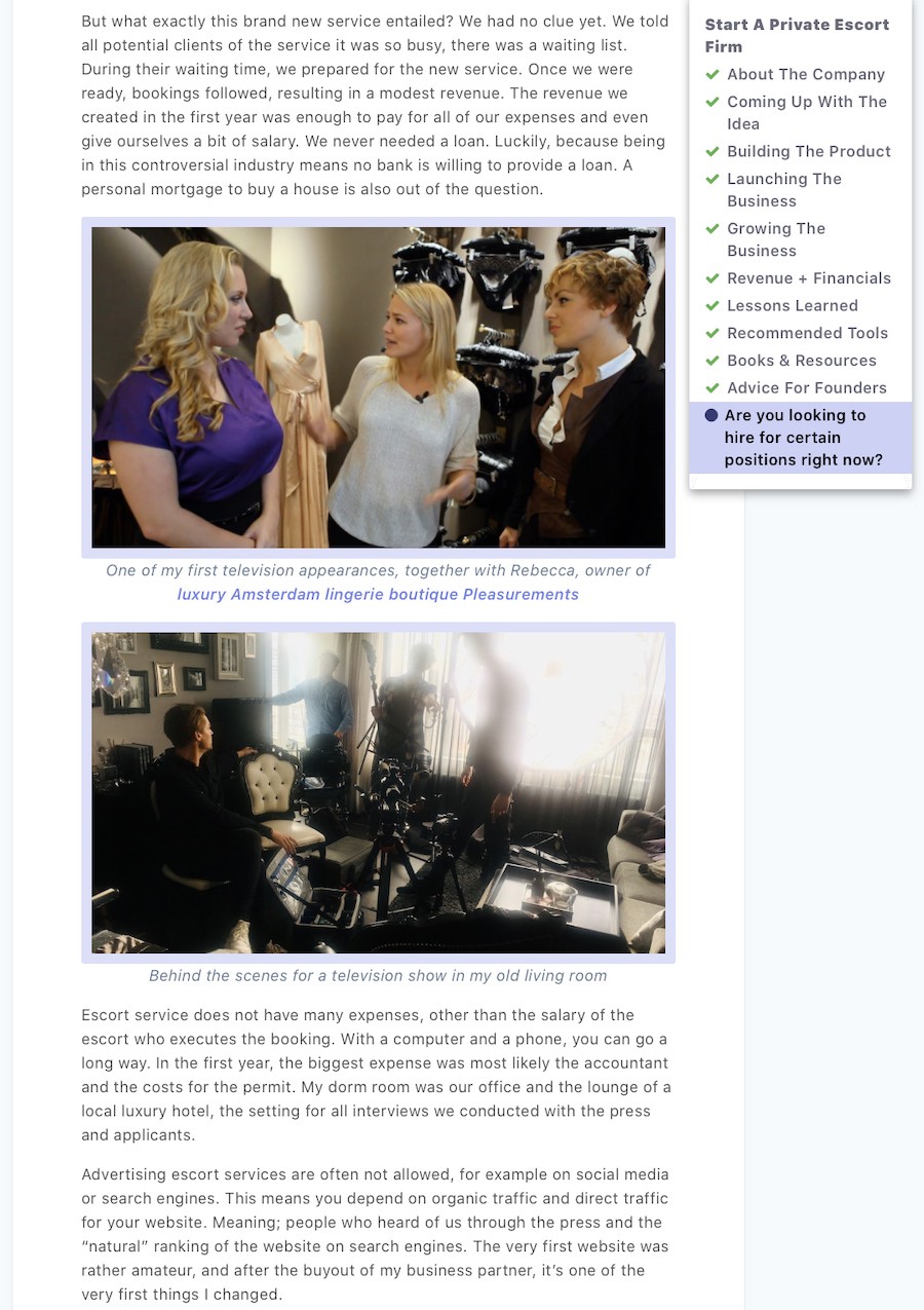 Op 5 oktober publiceerde Starter Story een case study over onze high class escortservice. Starter Story is een online platform waar succesvolle ondernemers worden geïnterviewd en de verhalen achter hun bedrijf delen. In elk interview wordt hen gevraagd hoe ze zijn begonnen, hoe ze zijn gegroeid en hoe ze vandaag hun bedrijf runnen. De verhalen zijn inspirerend en geven ook gericht advies en inzicht bij het starten van een bedrijf. Door deze verhalen te delen, wil Starter Story anderen op weg helpen. Het interview is te vinden op de website van Starter Story en hieronder te lezen. Een gedeeltelijke vertaling in Nederlands is ook toegevoegd. Meld u vooral aan op dit platform, het staat vol met interessante interviews!