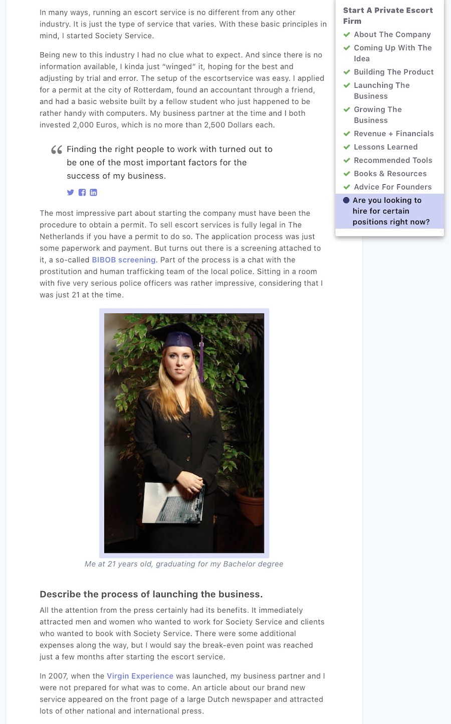 Het meest indrukwekkende aan het starten van het bedrijf moet de procedure zijn geweest om een vergunning te krijgen. Het verkopen van escortservices is volledig legaal in Nederland als u hiervoor een vergunning heeft. De aanvraagprocedure was slechts wat papierwerk en betaling. Maar er blijkt een screening aan vast te zitten, een zogenaamde BIBOB-screening. Onderdeel van het proces is een gesprek met het team prostitutie en mensenhandel van de lokale politie. In een kamer zitten met vijf zeer serieuze politieagenten was behoorlijk indrukwekkend, gezien het feit dat ik toen pas 21 was.