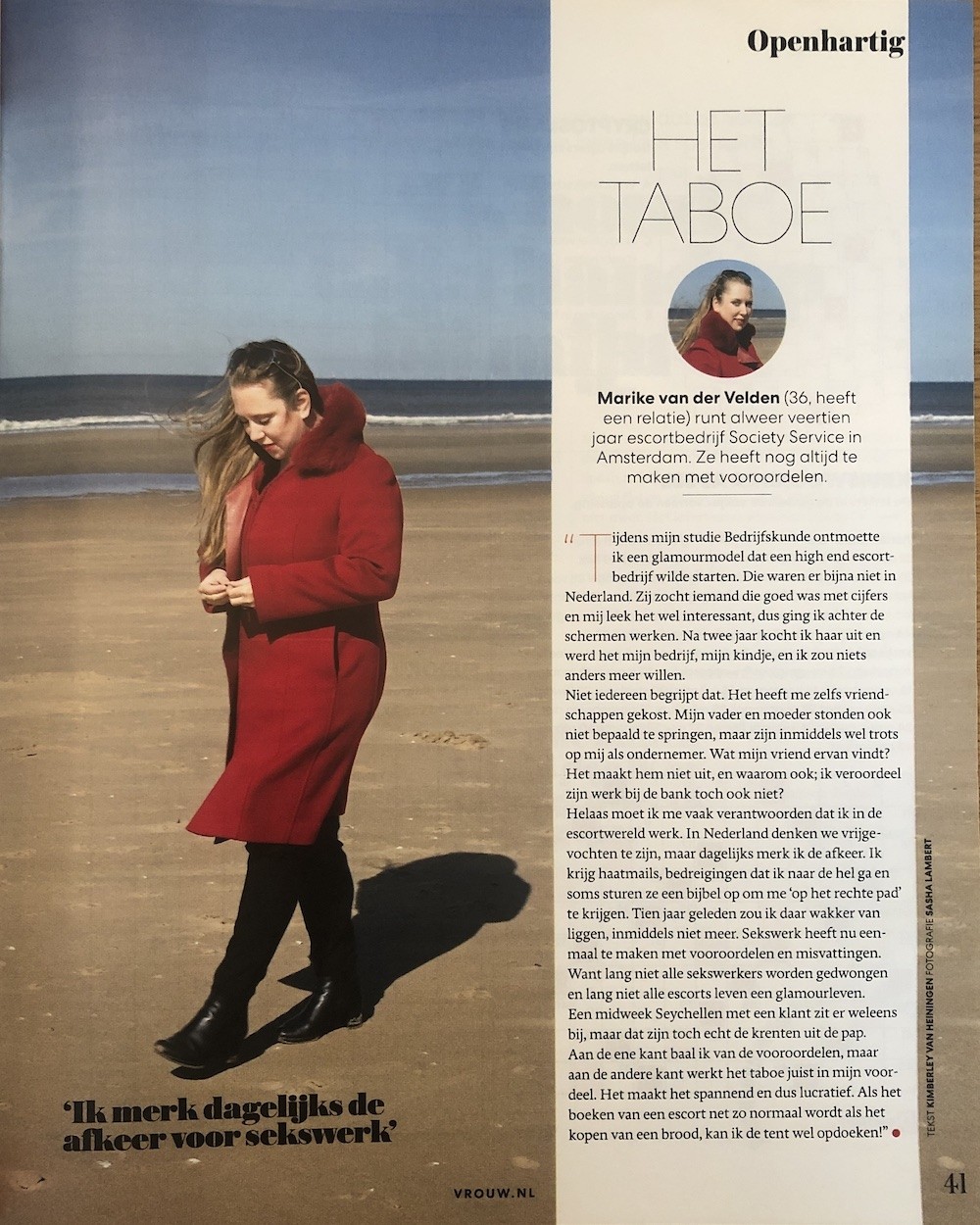 Op 27 november publiceerde Telegraaf Vrouw een artikel over Marike, eigenaresse van onze high end escortservice, in de rubriek "Het Taboe". In deze rubriek komen personen aan het woord die te maken hebben met taboes. Uiteraard mocht het runnen van een high class escortservice niet ontbreken in deze rubriek. Het artikel is zowel in het blad gepubliceerd als op de website van telegraaf. Lees het artikel van Telegraaf Vrouw op hun website of bekijk en lees het hier beneden.