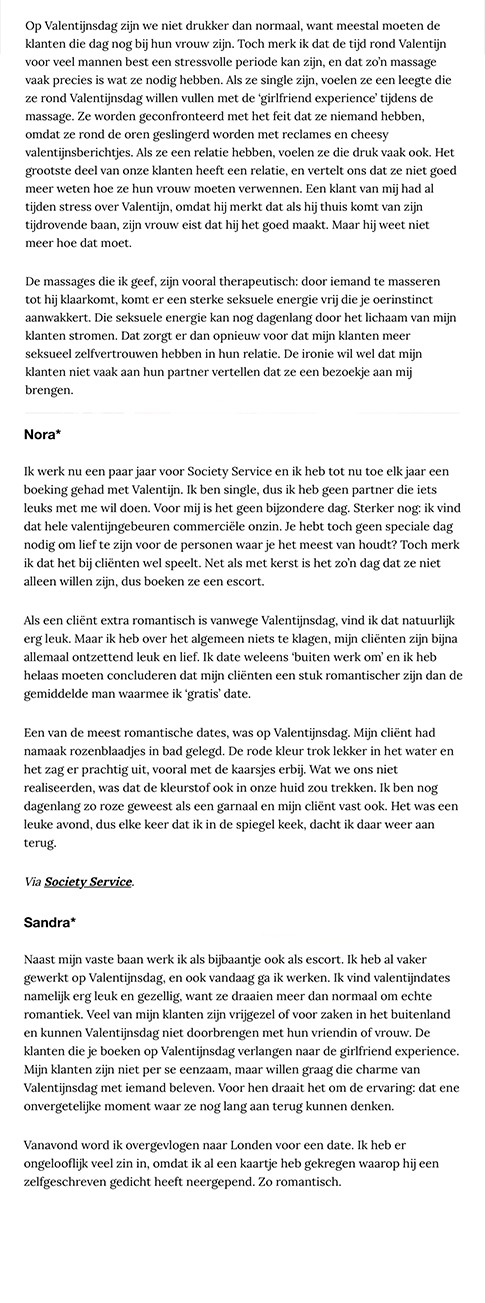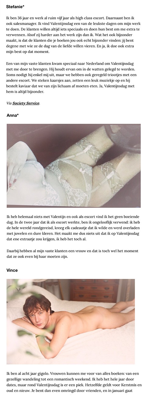 Op 14 februari publiceerde online magazine Vice en artikel over hoe sekswerkers valentijn vieren. Een paar escorts van onze high class escortservice werden hiervoor geïnterviewd, tezamen met andere sekswerkers zoals een gigolo en erotisch masseuse. Zij vertellen over hoe romantisch Valentijnsdag is met een cliënt. Het originele artikel kunt u hier vinden maar ook hier beneden lezen.
