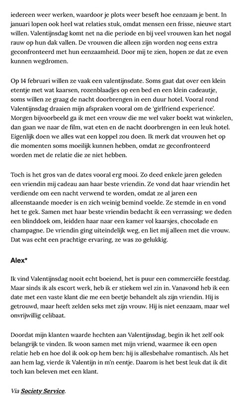 “Naast mijn vaste baan werk ik als bijbaantje ook als escort. Ik heb al vaker gewerkt op Valentijnsdag, en ook vandaag ga ik werken. Ik vind valentijndates namelijk erg leuk en gezellig, want ze draaien meer dan normaal om echte romantiek. Veel van mijn klanten zijn vrijgezel of voor zaken in het buitenland en kunnen Valentijnsdag niet doorbrengen met hun vriendin of vrouw. De klanten die je boeken op Valentijnsdag verlangen naar de girlfriend experience. Mijn klanten zijn niet per se eenzaam, maar willen graag die charme van Valentijnsdag met iemand beleven. Voor hen draait het om de ervaring: dat ene onvergetelijke moment waar ze nog lang aan terug kunnen denken. Vanavond word ik overgevlogen naar Londen voor een date. Ik heb er ongelooflijk veel zin in, omdat ik al een kaartje heb gekregen waarop hij een zelfgeschreven gedicht heeft neergepend. Zo romantisch.”