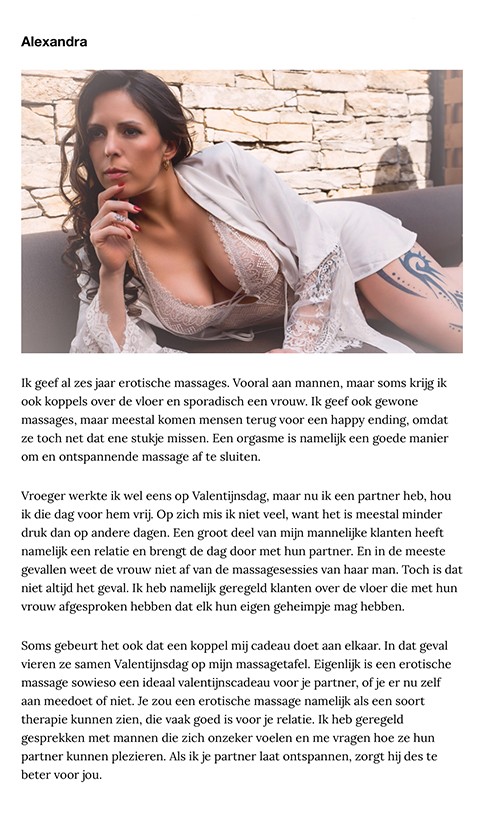 “Ik geef al zes jaar erotische massages. Vooral aan mannen, maar soms krijg ik ook koppels over de vloer en sporadisch een vrouw. Ik geef ook gewone massages, maar meestal komen mensen terug voor een happy ending, omdat ze toch net dat ene stukje missen. Een orgasme is namelijk een goede manier om en ontspannende massage af te sluiten. Vroeger werkte ik wel eens op Valentijnsdag, maar nu ik een partner heb, hou ik die dag voor hem vrij. Op zich mis ik niet veel, want het is meestal minder druk dan op andere dagen. Een groot deel van mijn mannelijke klanten heeft namelijk een relatie en brengt de dag door met hun partner. En in de meeste gevallen weet de vrouw niet af van de massagesessies van haar man. Toch is dat niet altijd het geval. Ik heb namelijk geregeld klanten over de vloer die met hun vrouw afgesproken hebben dat elk hun eigen geheimpje mag hebben. Soms gebeurt het ook dat een koppel mij cadeau doet aan elkaar. In dat geval vieren ze samen Valentijnsdag op mijn massagetafel. Eigenlijk is een erotische massage sowieso een ideaal valentijnscadeau voor je partner, of je er nu zelf aan meedoet of niet. Je zou een erotische massage namelijk als een soort therapie kunnen zien, die vaak goed is voor je relatie. Ik heb geregeld gesprekken met mannen die zich onzeker voelen en me vragen hoe ze hun partner kunnen plezieren. Als ik je partner laat ontspannen, zorgt hij des te beter voor jou.”