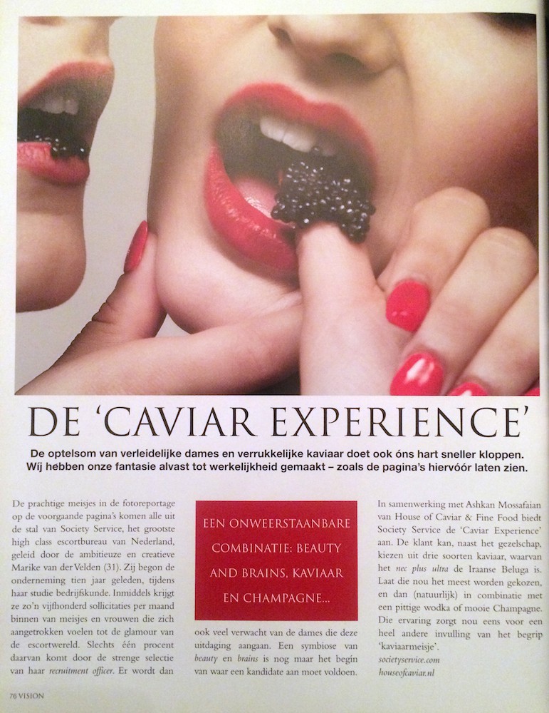 Op 4 maart 2016, publiceerde magazine Vision een reportage over de Kaviaar Experience van high class escortservice Society Service. De reportage is gemaakt in samenwerking met House of Caviar. De modellen op de foto zijn escorts van onze high class escortservice. Bekijk en lees het artikel hier.