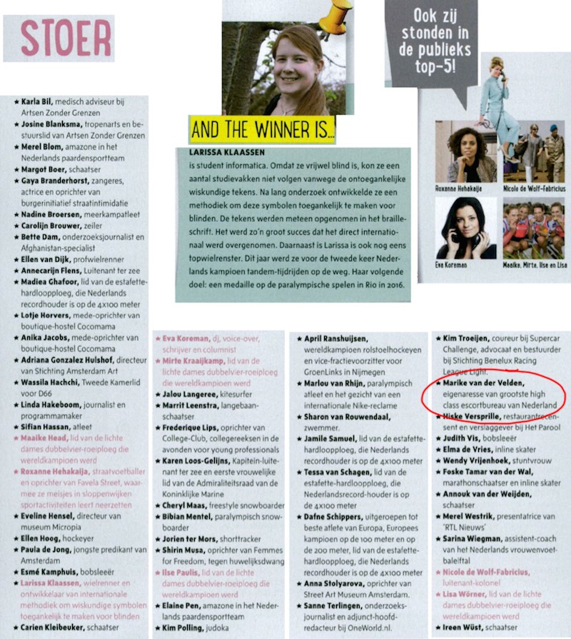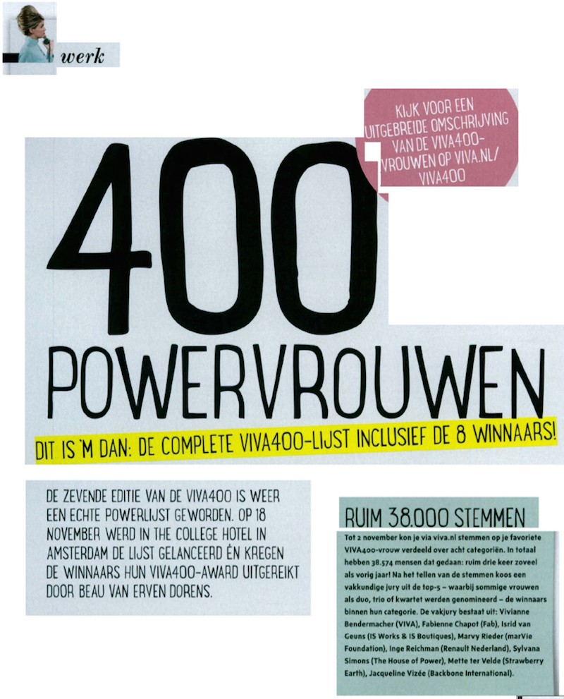 Op 18 november werd de Viva 400 lijst van magazine Viva gepresenteerd. Marike staat in de Viva 400 in de categorie "stoer". De Viva 400 is een jaarlijkse lijst van de meest inspirerende powervrouwen van Nederland. De lijst is verdeeld in 8 categorieën waaronder de categorie "Stoer" waar Marike (eigenaar en oprichter van Society Service) in vermeld stond voor het runnen van haar bedrijf en schrijven van het boek de Escort Bijbel.