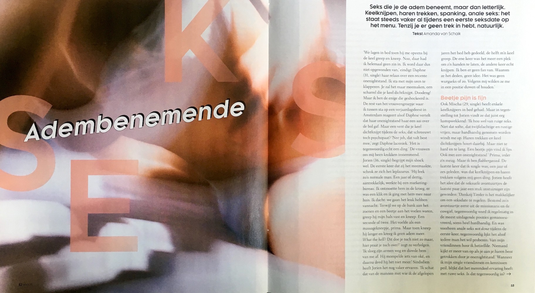 ‘We lagen in bed toen hij me opeens bij de keel greep en kneep. Nou, daar had ik helemaal geen zin in. Ik word daar dus niet opgewonden van,’ eindigt Daphne (31, single) haar relaas over een recente onenightstand. Ik sta met mijn oren te klapperen. Je zal het maar meemaken, een scharrel die je keel dichtknijpt. Doodeng! Maar ik ben de enige die geshockeerd is. De rest van het vrouwengroepje waar ik tussen sta op een verjaardagsfeest in Amsterdam reageert alsof Daphne vertelt dat haar onenightstand haar een aai over de bol gaf. Maar een vent die je keel dichtknijpt tijdens de seks, dat schreeuwt toch psychopaat? ‘Nee joh, dat valt best mee,’ zegt Daphne laconiek. ‘Het is tegenwoordig echt een ding.’ De vrouwen om mij heen knikken instemmend.