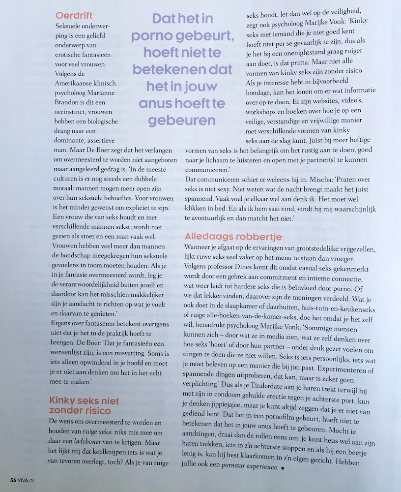 Op 27 maart publiceerde magazine Viva een artikel over hoe seks steeds ruiger word. Een aantal vrouwen vertellen over hun ervaringen maar ook onze high class escortservice komt aan het woord. We vertellen over onze Pornstar Experience en de invloed op onervaren mannen zoals bij de Ontknaapservice. Lees het artikel hier en bekijk het volledige artikel ook.